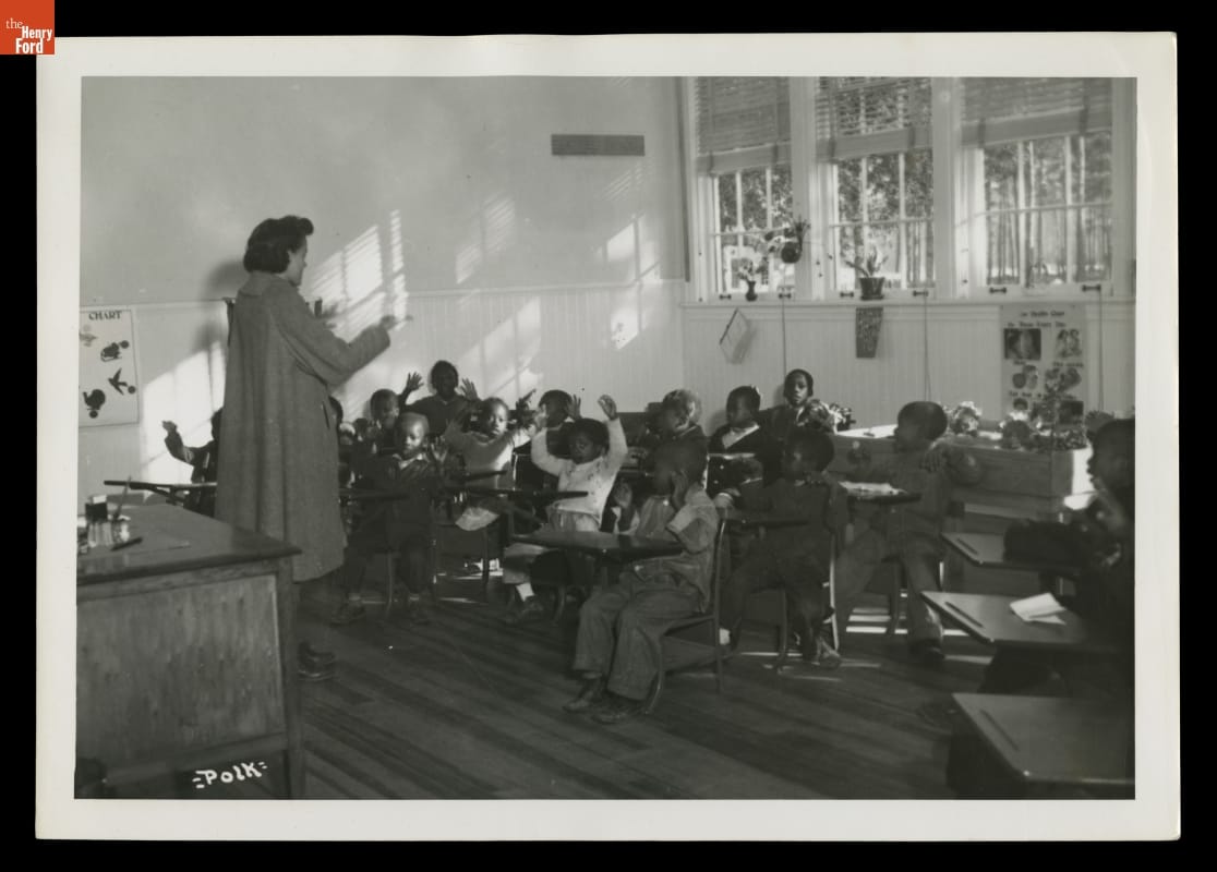 Henry Ford purchased vast amounts of land around present-day Richmond Hill, Georgia, beginning in the 1920s. After acquiring the property, Ford became interested in the economic and civic improvement of the area. He built schools, churches and community centers. In 1939, Ford founded the George Washington Carver School. This image shows first grade students attending classes in the new school.