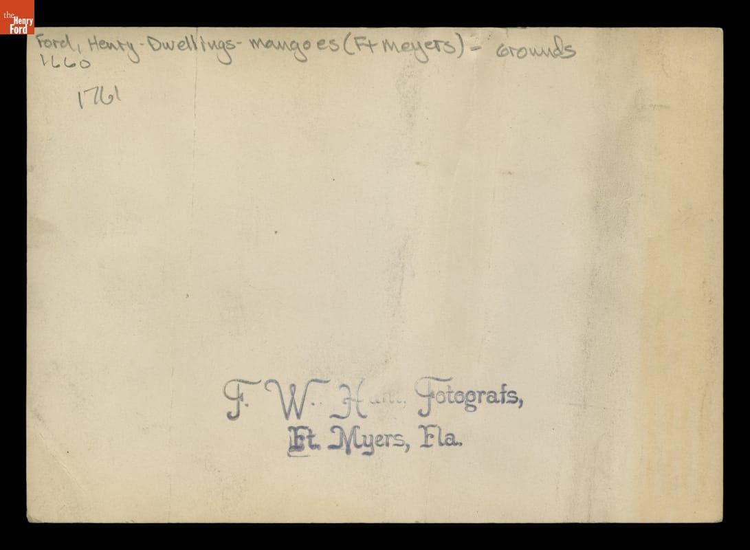 In 1916, Henry and Clara Ford purchased "The Mangoes." The Fort Myers, Florida, property adjoined the winter home of Thomas Edison -- Henry's friend and mentor. The Fords' estate featured a Craftsman bungalow and grounds lush with citrus trees and tropical plants. This image shows the variety of plant life found at the Fords' winter retreat.