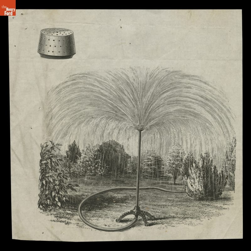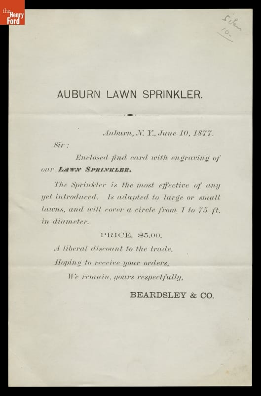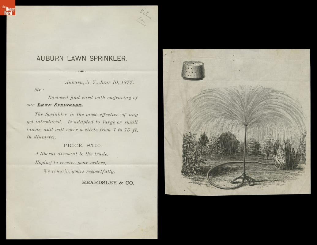 Homeowners who want green lawns need to water them during dry weather. In the late nineteenth century this usually meant spreading water by using hand pumps or water barrel trucks. Those fortunate to live in areas with pressurized, municipal water systems could also use sprinklers. This 1877 circular touted the effectiveness of the Auburn Lawn Sprinkler.