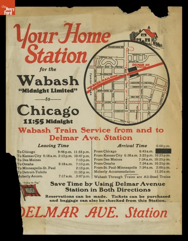 Text from top reads in part: Your Home / Station / for the / Wabash / "Midnight Limited" to / Chicago... DELMAR AVE. Station