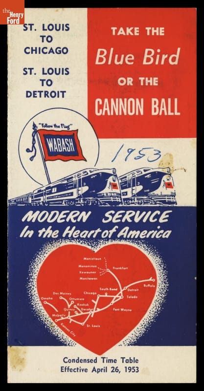 Brochure and Timetable for Wabash Railroad's Blue Bird or Cannon Ball Streamliner, "Modern Service in the Heart of America," 1953