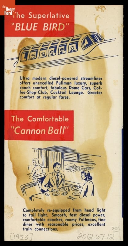 This 1953 brochure features two of the Wabash's major Midwestern lines, both offering "modern service in the 'Heart of America'" -- the modern diesel-powered Blue Bird streamliner and the comfortable diesel-powered Cannon Ball.