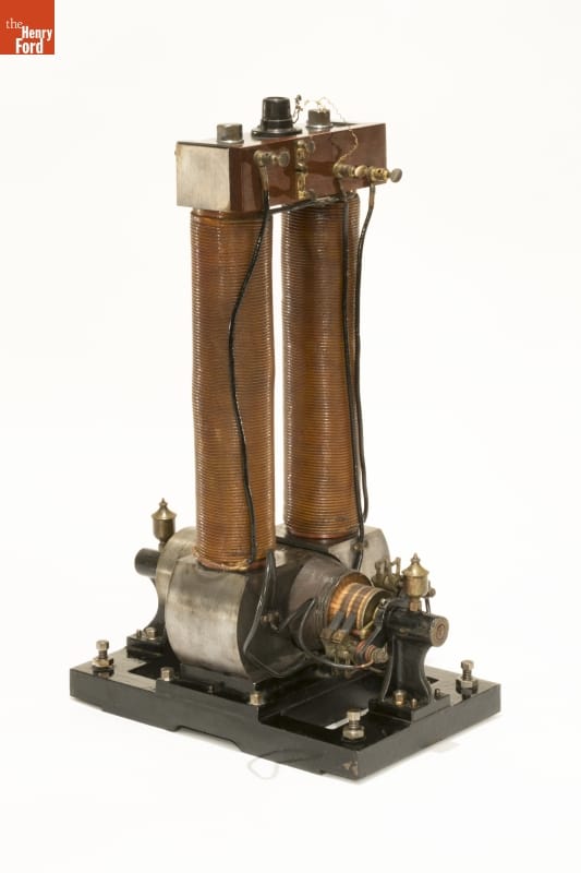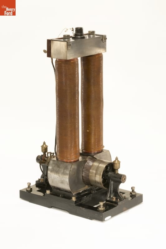 Henry Ford firmly believed in the "practical educational value" of World's Fair exhibits. During the 1939-40 New York World's Fair, he highlighted the work of students attending his experimental schools. In a miniature machine shop in the Ford building, boys from Ford's Edison Institute Schools operated quarter-size replicas, including this dynamo, based on machines from Thomas Edison's Menlo Park.