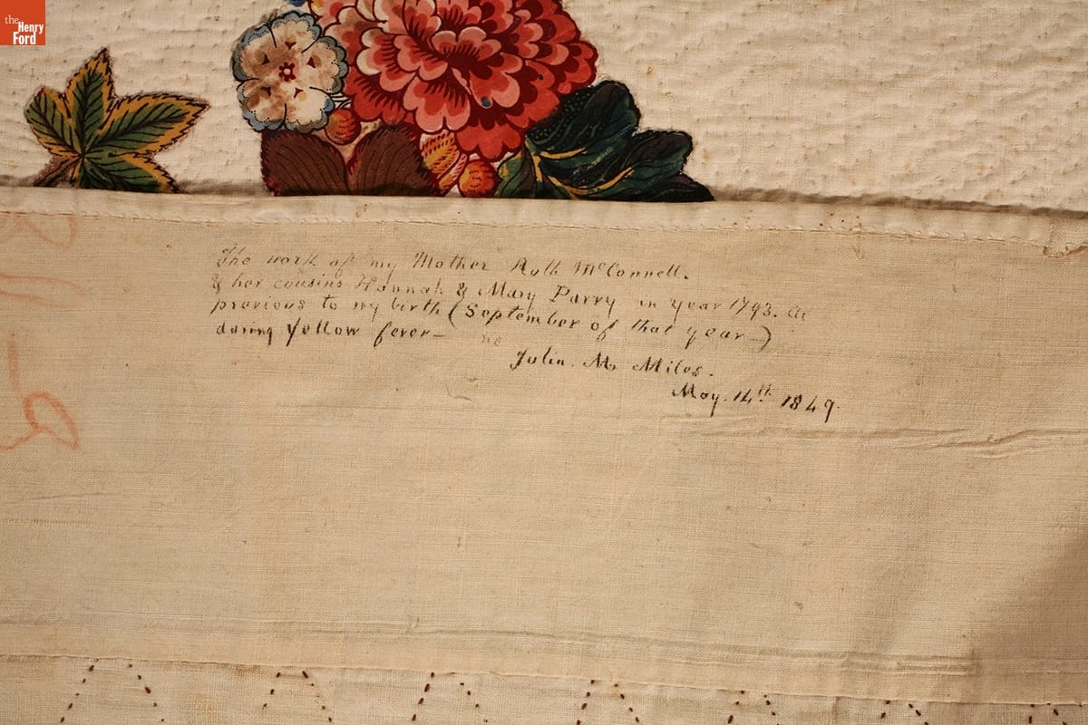 At first glance, Ruth McConnell's quilt looks as though she embroidered its design. Yet its flowers, birds, and other elements were cut from colorfully printed chintz and sewn onto the background fabric. (These quilts were later called "broderie perse," French for Persian embroidery.). Ruth completed this quilt shortly before Philadelphia's 1793 Yellow Fever epidemic -- as her daughter Julia noted on the back in 1849.