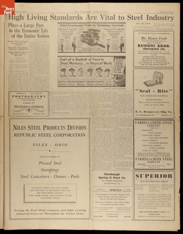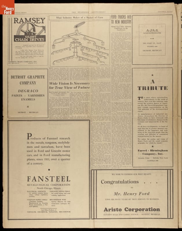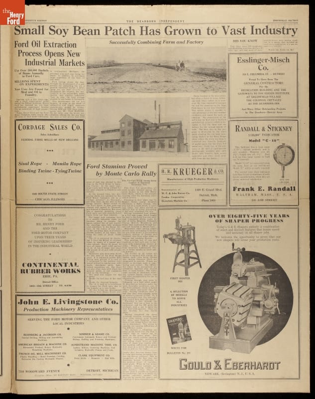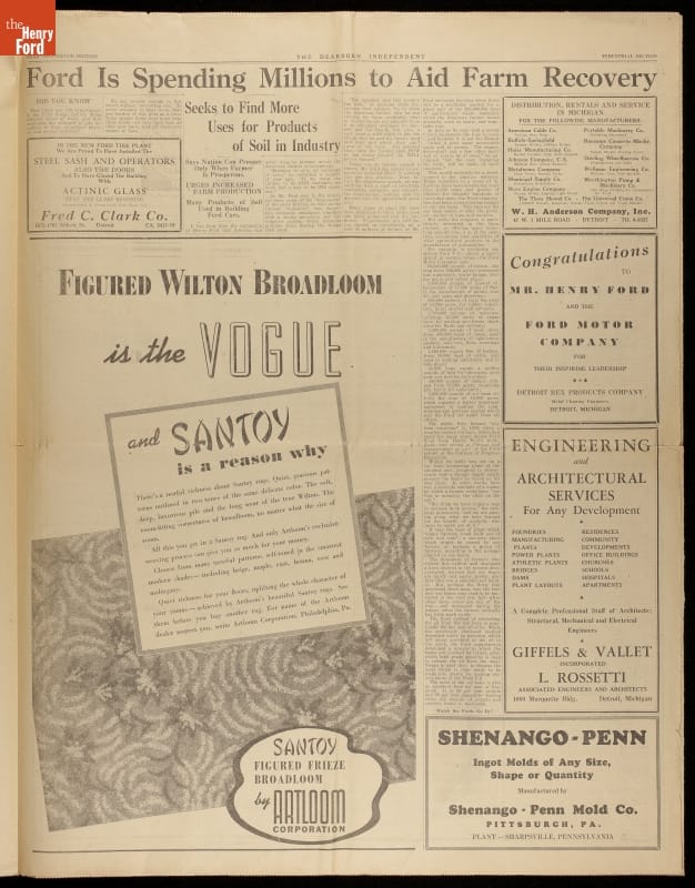 In 1938, the Dearborn Independent published a special section highlighting Ford Motor Company's successes during the Great Depression. The cover image represented a longtime interest of Henry Ford's: the mutual relationship between industry and agriculture. Henry Ford had owned the Dearborn Independent from 1919 to 1927, and he had used it to publish notoriously anti-Semitic editorials and articles.