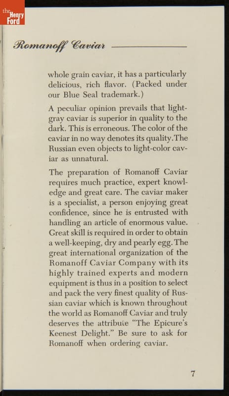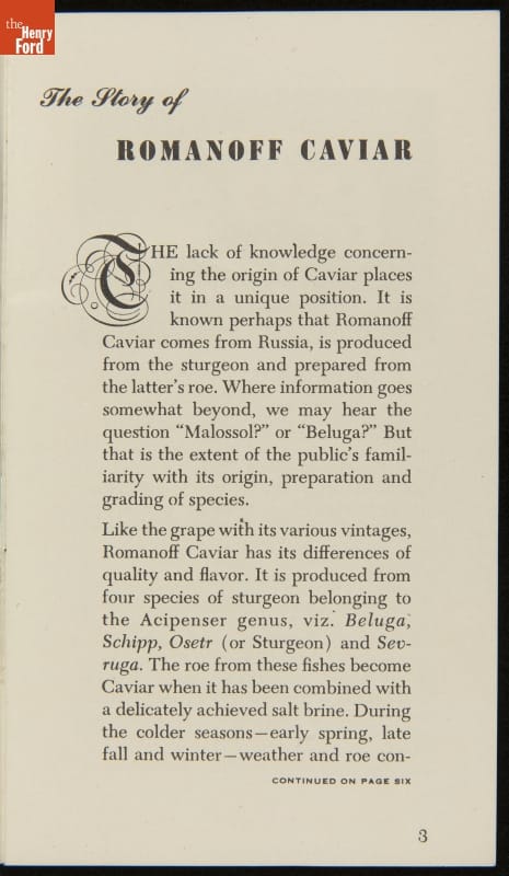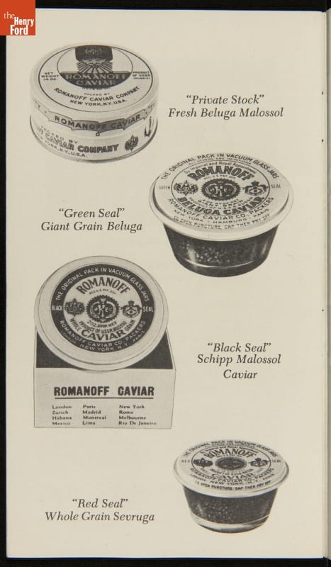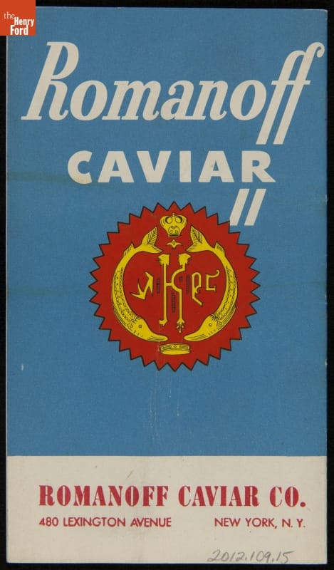 Published by the Romanoff Caviar Company, New York, New York. Distributed by A. Rensch & Co., Toledo, Ohio.
