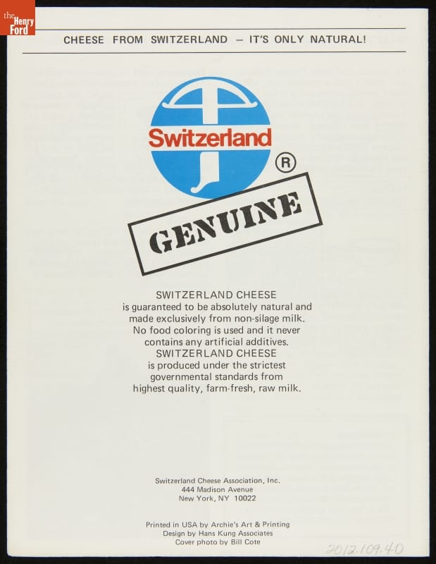 Published by Switzerland Cheese Association, New York, New York. Advertised products sold by A. Rensch & Co., Toledo, Ohio.