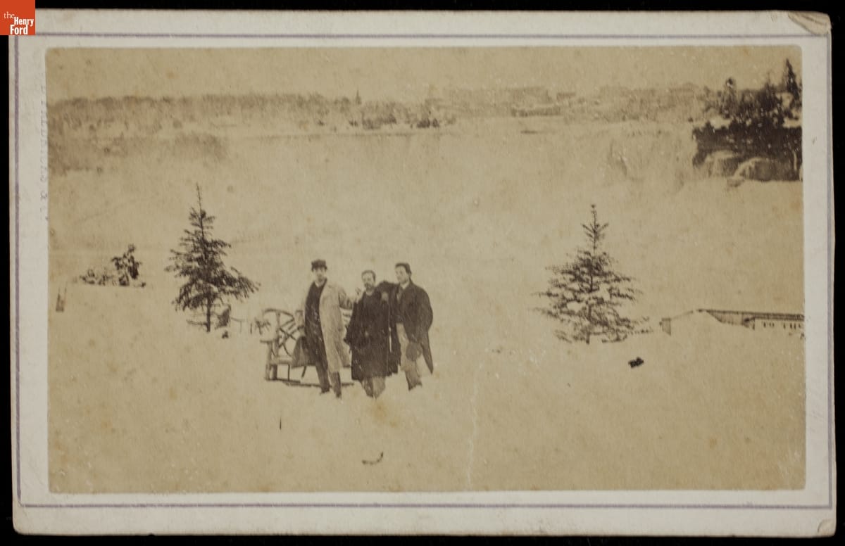 Three Men in Front of Frozen Waterfall, 1860-1890