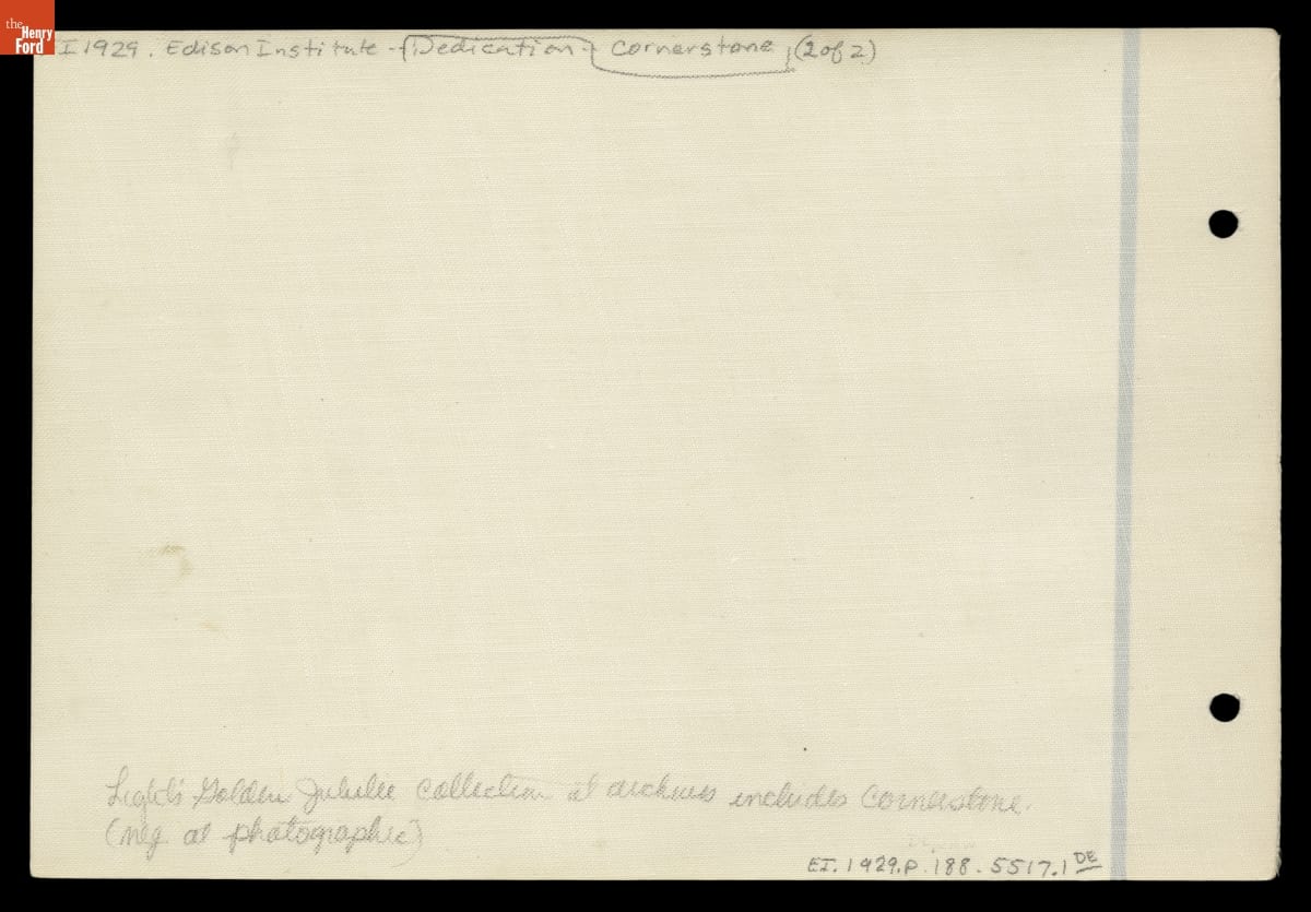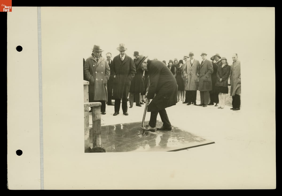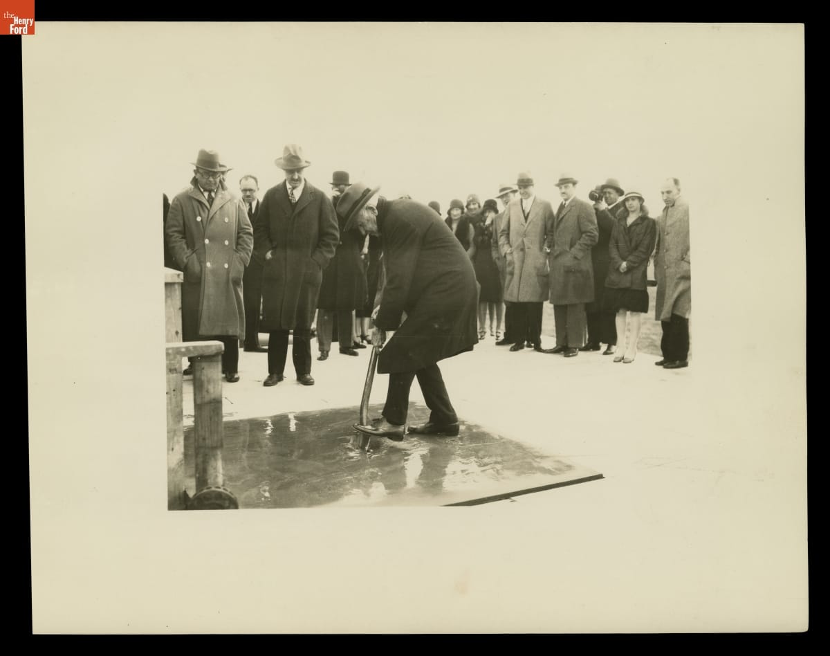 Thomas Edison Placing Luther Burbank's Spade into the Edison Institute Cornerstone, September 27, 1928