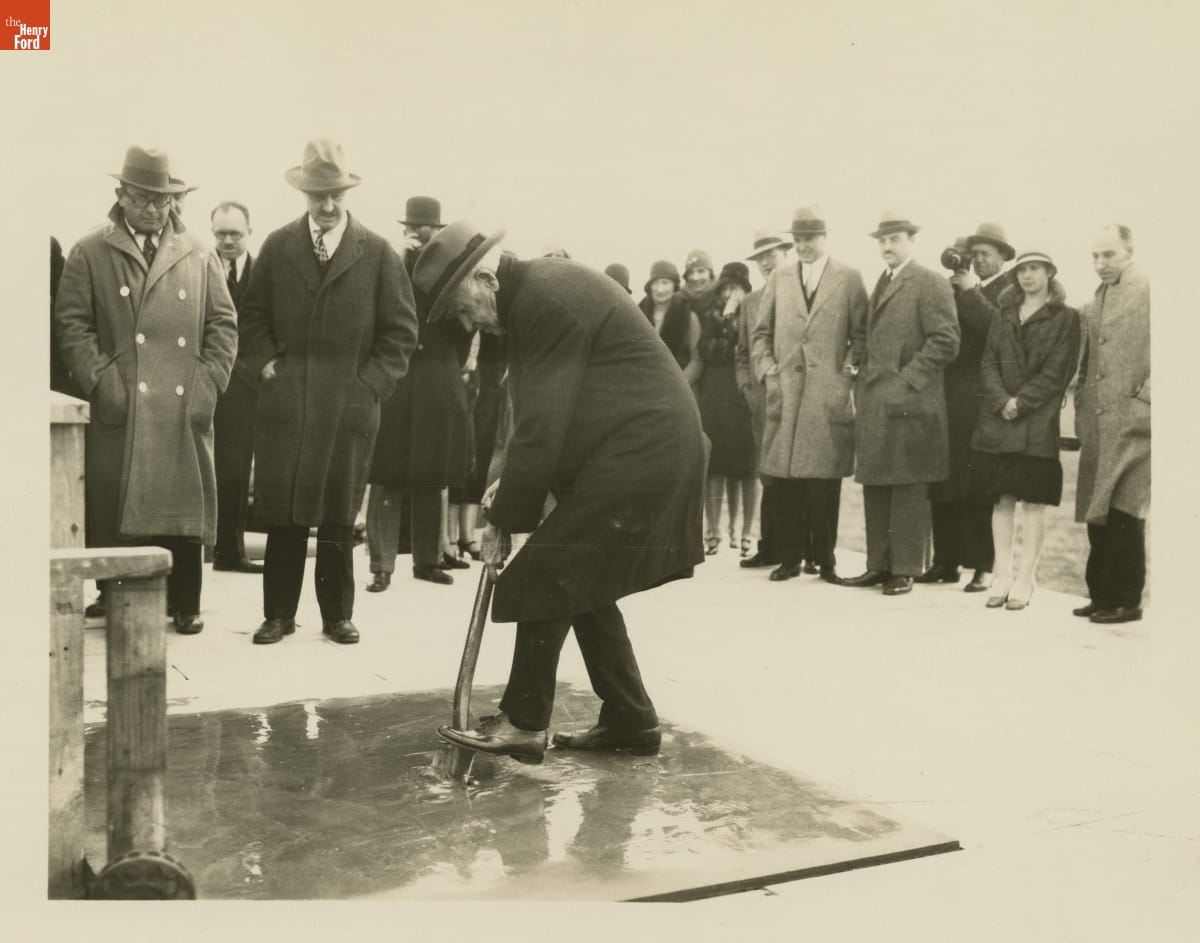 September 27th, 1928, on the future site of Henry Ford's new museum, famed inventor Thomas Edison placed a spade once used by legendary horticulturist Luther Burbank into a block of freshly poured Portland cement. Afterwards, Ford watched his friend and personal hero write his name in the wet cement, officially dedicating Henry Ford Museum--where this "cornerstone" is now displayed.