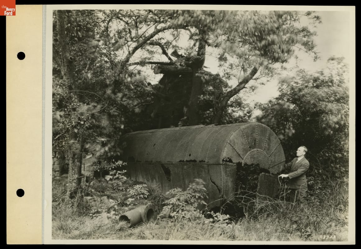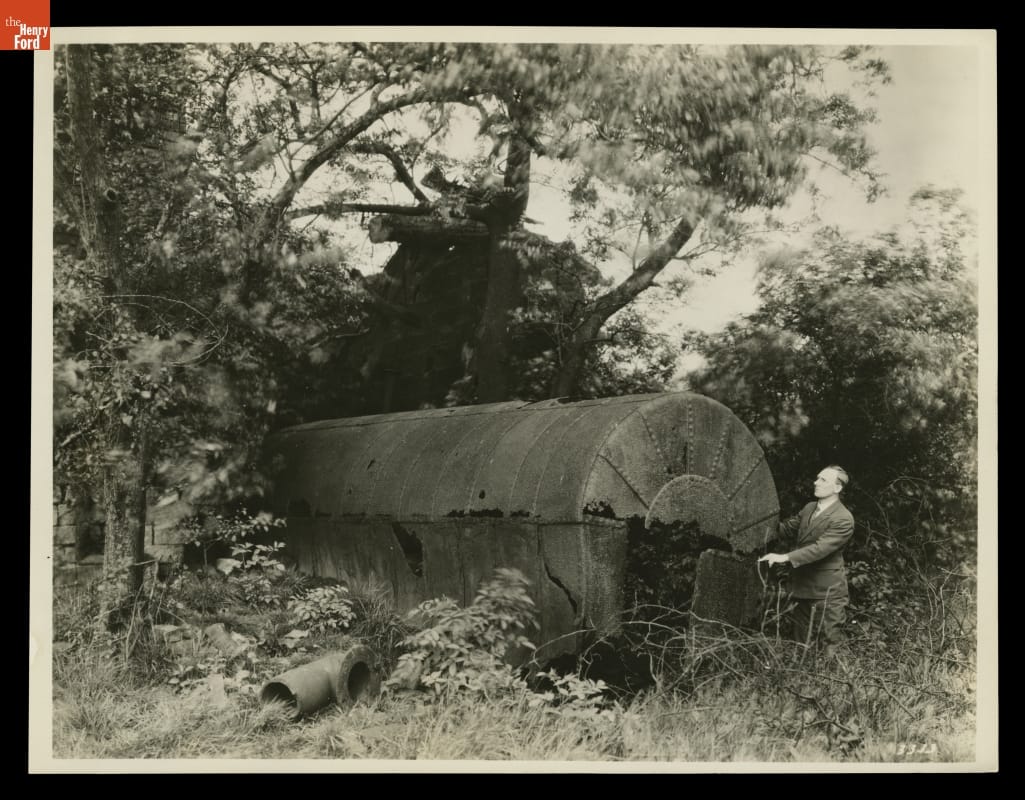 In 1929, Henry Ford acquired the oldest known surviving steam engine. It lay in ruin near Ashton-under-Lyne, England. Ford charged Herbert Morton, an employee working in England, to gather what remained of the original engine and transport it to Dearborn, Michigan. This photograph shows Morton on the engine's site with a later boiler that was not retained by Henry Ford.