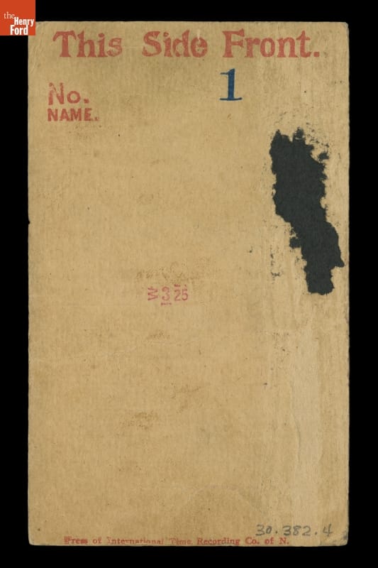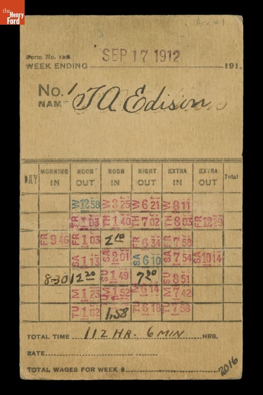Time Card Punched by Thomas Edison at His West Orange Laboratory, for the Week Ending September 17, 1912