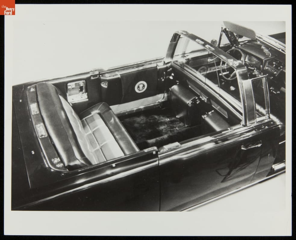 The Hess & Eisenhardt Company of Cincinnati, Ohio, transformed a stock 1961 Lincoln Continental convertible into the presidential limousine. The modified car's interior included a blue mouton rug; two dark blue broadcloth lap robes, embroidered with the presidential seal, that tucked into pockets in the doors; and two folding jump seats for additional passengers.