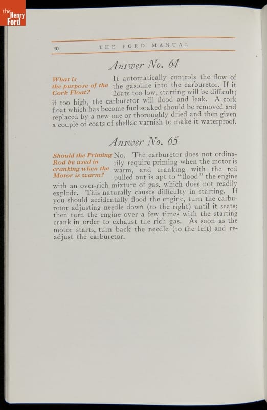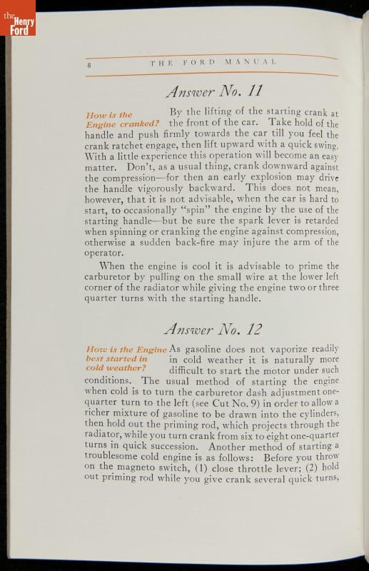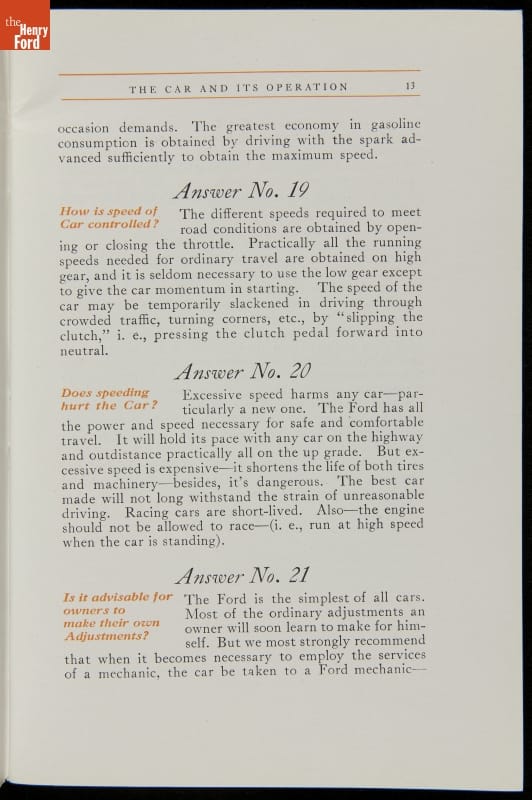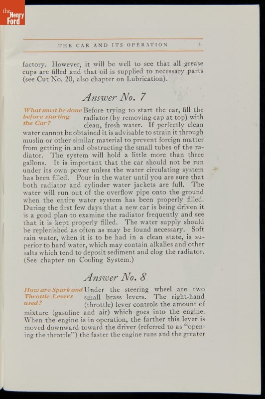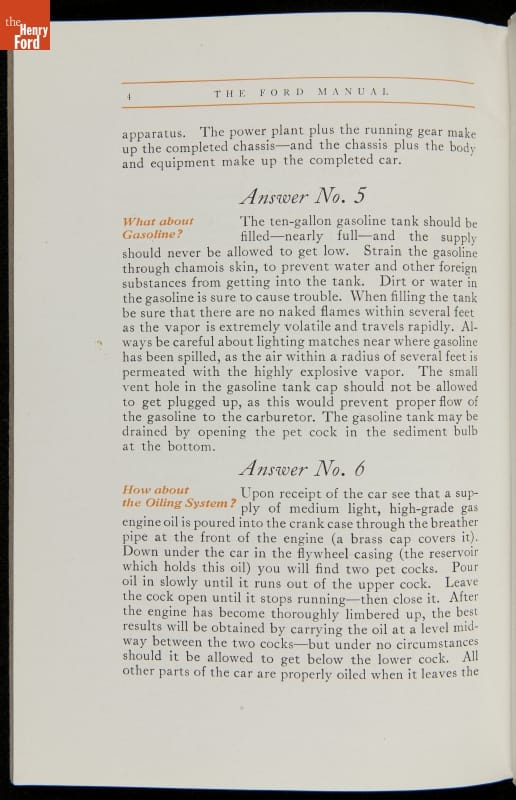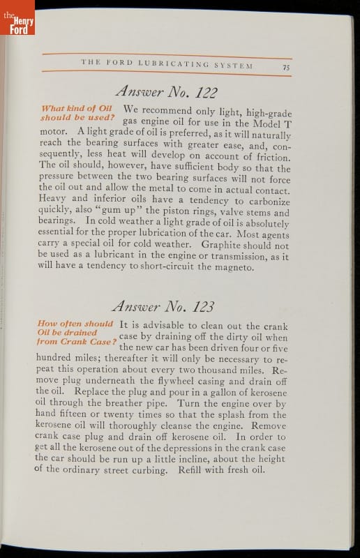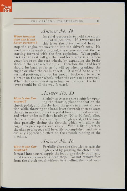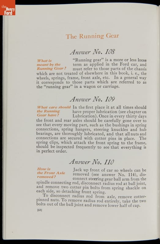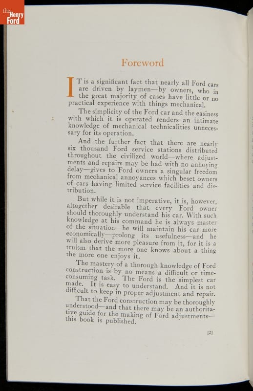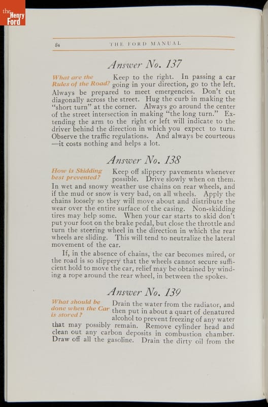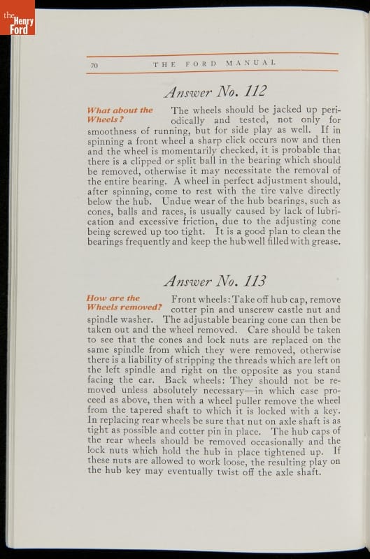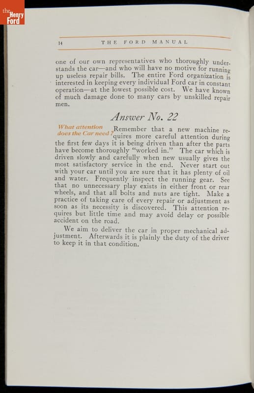 As cars became affordable and more people began using them, owners needed to know how to operate them properly. This 1914 manual helped the layperson -- without a mechanical or technical automotive background -- understand and drive the Ford Model T. Ford touted the T's simplicity, but its manual still provided over 140 answers to possible questions owners might have.