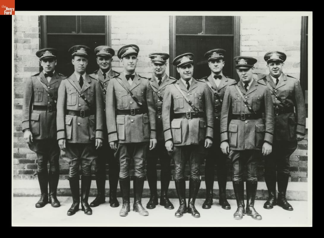 Greyhound bus drivers pose in their new uniforms in the late 1920s. These uniform jackets, pants, caps and boots gave drivers a very professional appearance--implying that Greyhound bus riders would enjoy a safe and comfortable trip with these experts at the wheel.