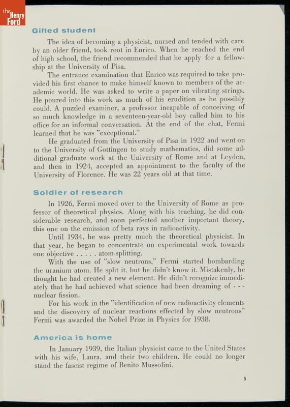 Brochure, "Dr. Enrico Fermi, 1901-1954," circa 1960