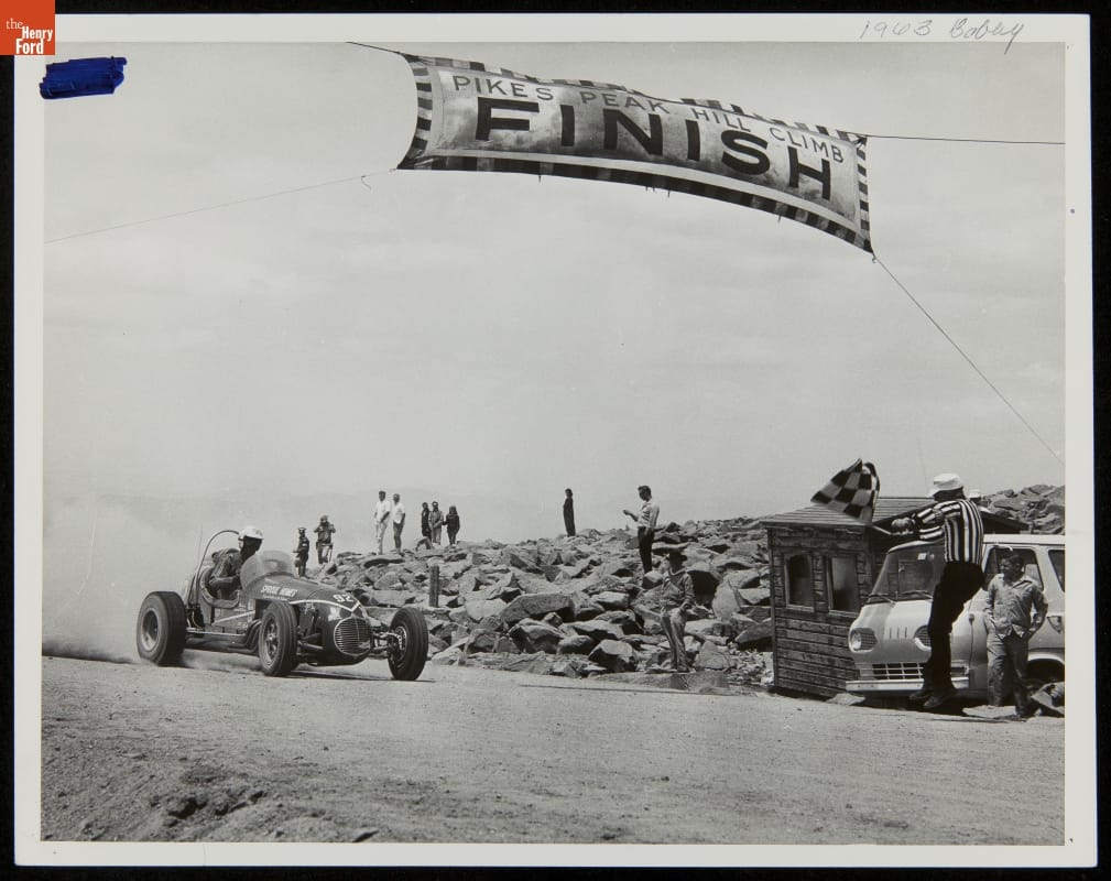 Bobby Unser Crossing the Finish Line, Pikes Peak Hill Climb, July 4, 1963