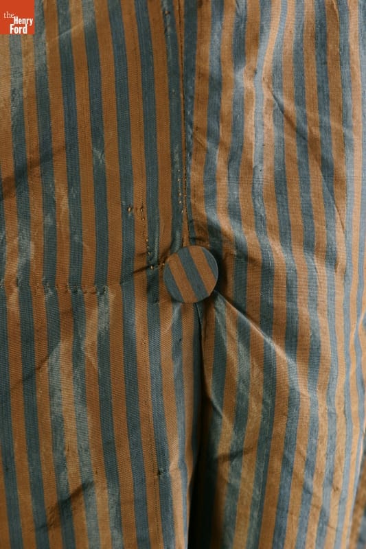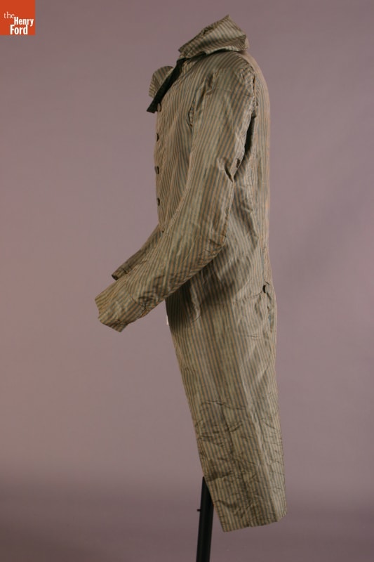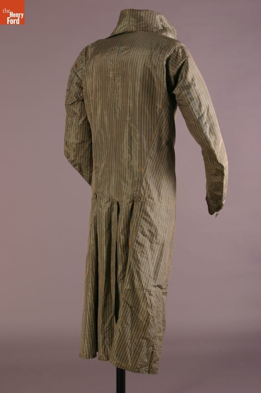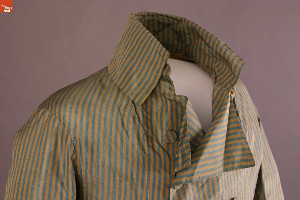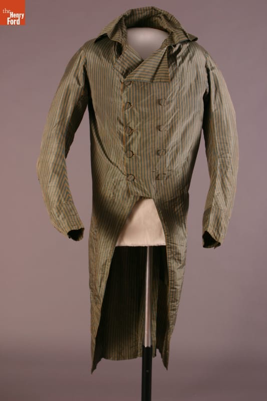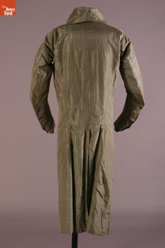 Inspired by French fashion, men of turn-of-the-nineteenth-century America padded their chests with layers of clothing. To achieve the stylish large-chested look, they often donned frilled shirts, puffy neckbands called cravats, at least one waistcoat, or vest, and an overcoat with a high, stiff collar. This taffeta example with long tails would have been considered very fashionable during its time.