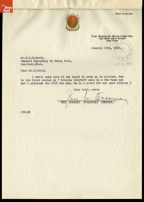 Rudolph Wurlitzer, a violin dealer and musical instrument manufacturer, had helped Ford acquire his Italian-made classical violins during the 1920s and kept them in good repair for the industrialist. Jay C. Freeman was the Wurlitzer Company's violin expert who handled the repairs. In this letter, Freeman mentions Grisha Goluboff, a young violinist to whom Ford had lent his 1703 Stradivari violin.