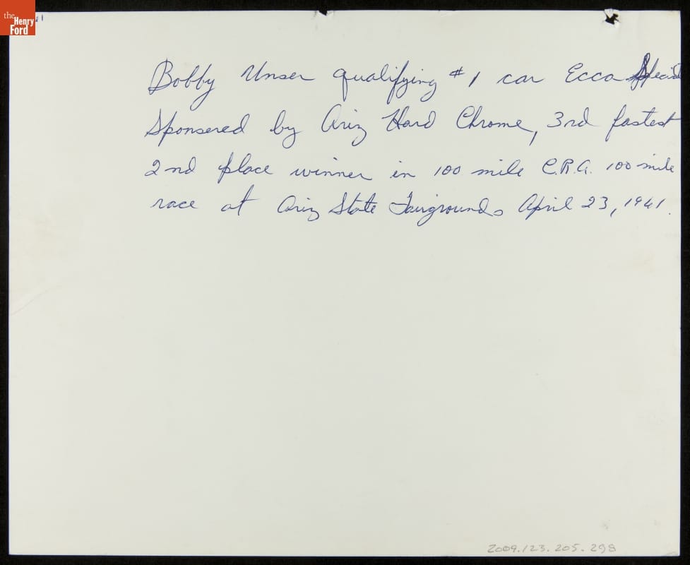Bobby Unser earned a place among automobile racing's greats, having successfully competed in nearly every form of the sport. The racing career of this three-time Indianapolis 500 winner and 13-time Pikes Peak International Hill Climb winner spanned more than 30 years. This photograph -- only one of thousands donated by Bobby and Lisa Unser to The Henry Ford -- helps to document his career.