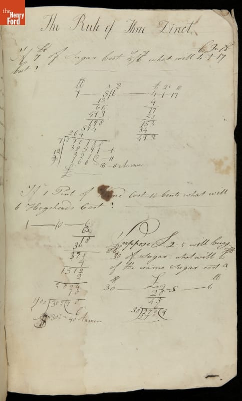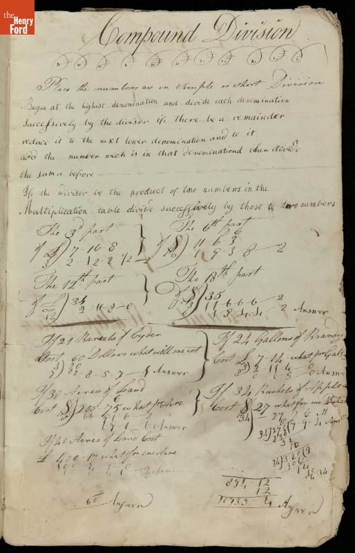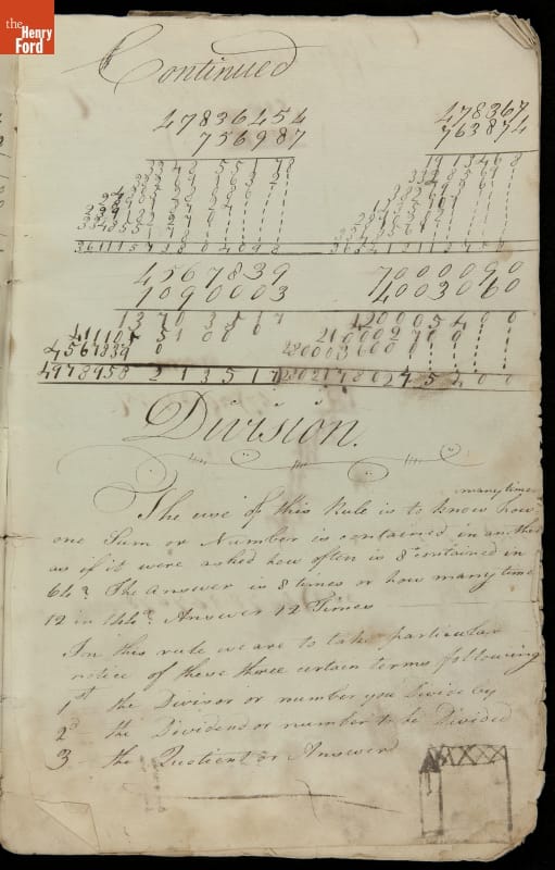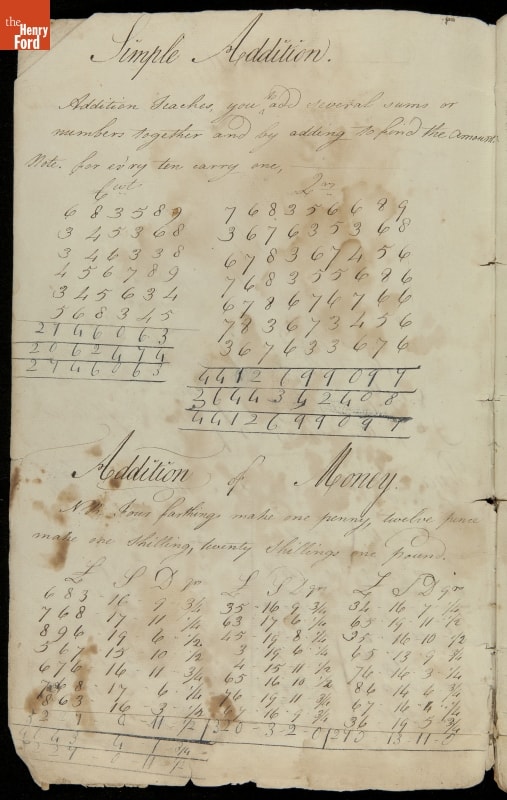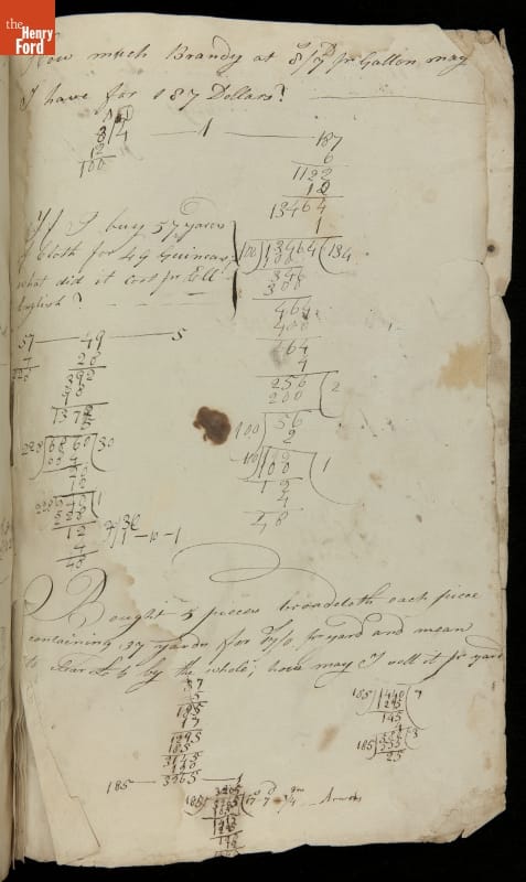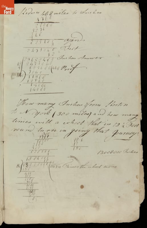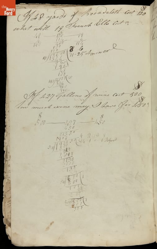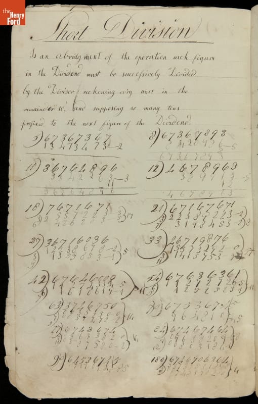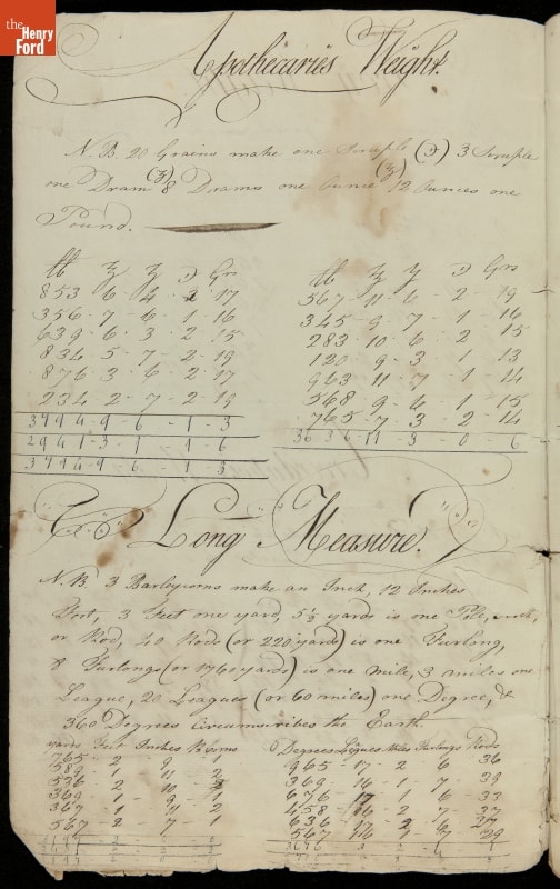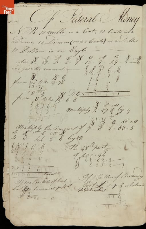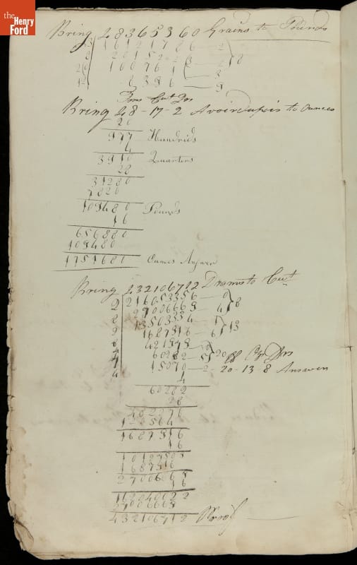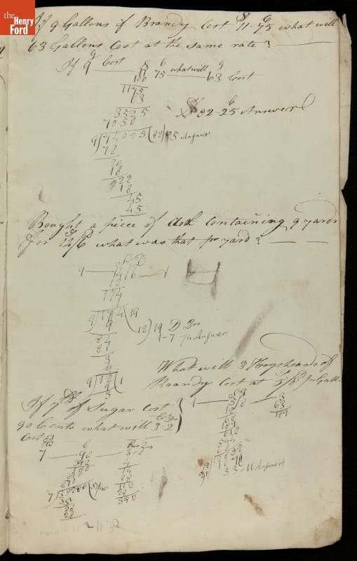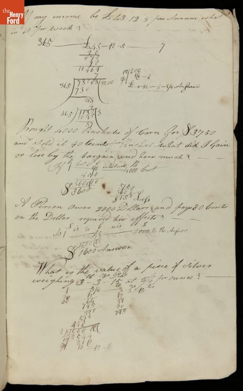 This copybook reveals arithmetic rules and examples and a student practicing numeration (place value), addition, subtraction, multiplication, division and conversions. The real-life problems reveal how Americans used math in their daily lives in 1800: measuring, buying and selling, making things, farming, eating and drinking, and more.