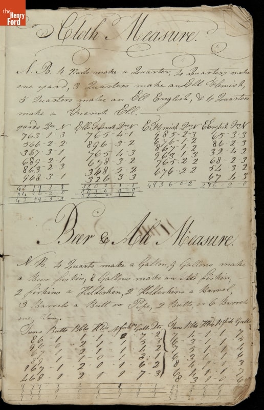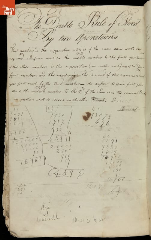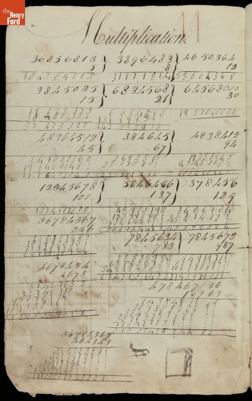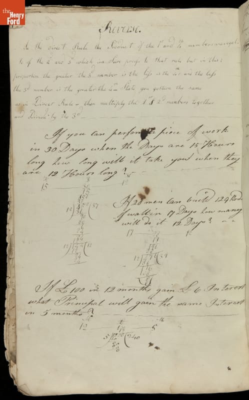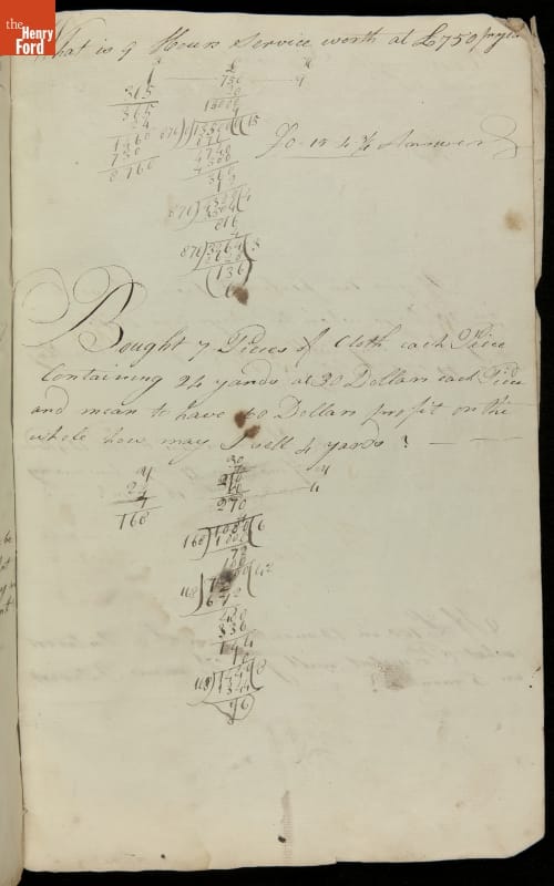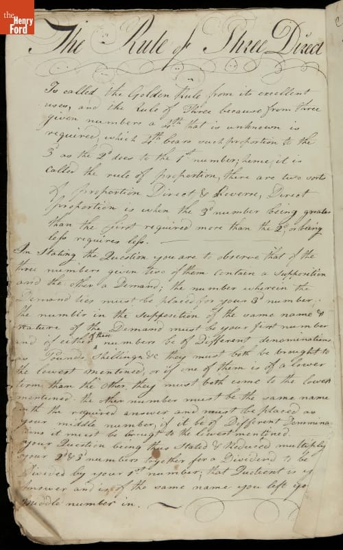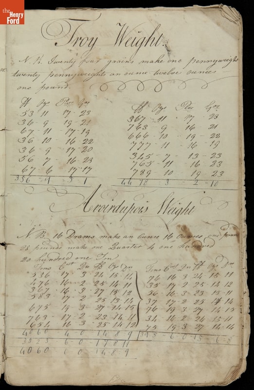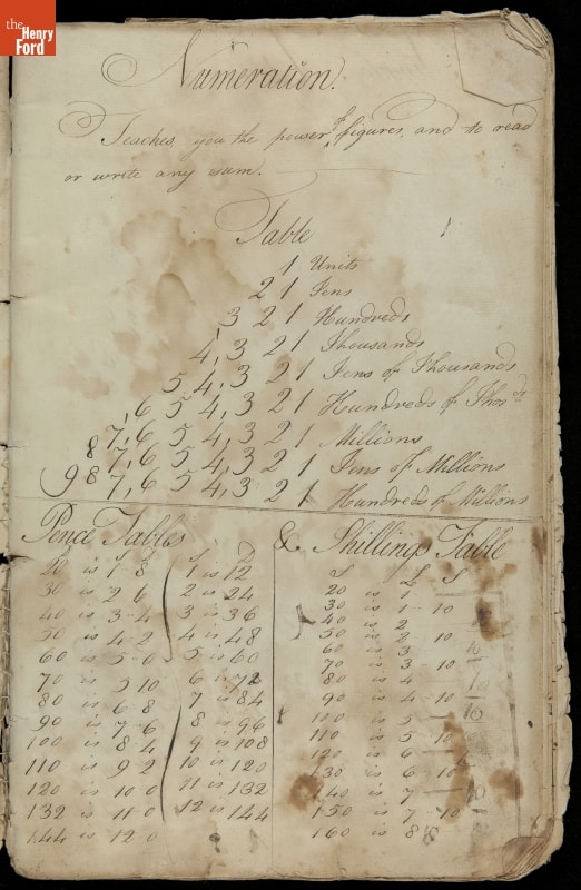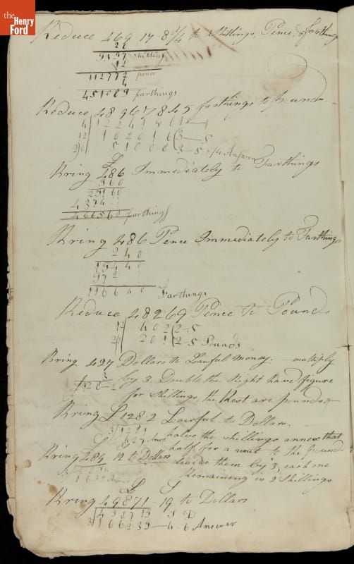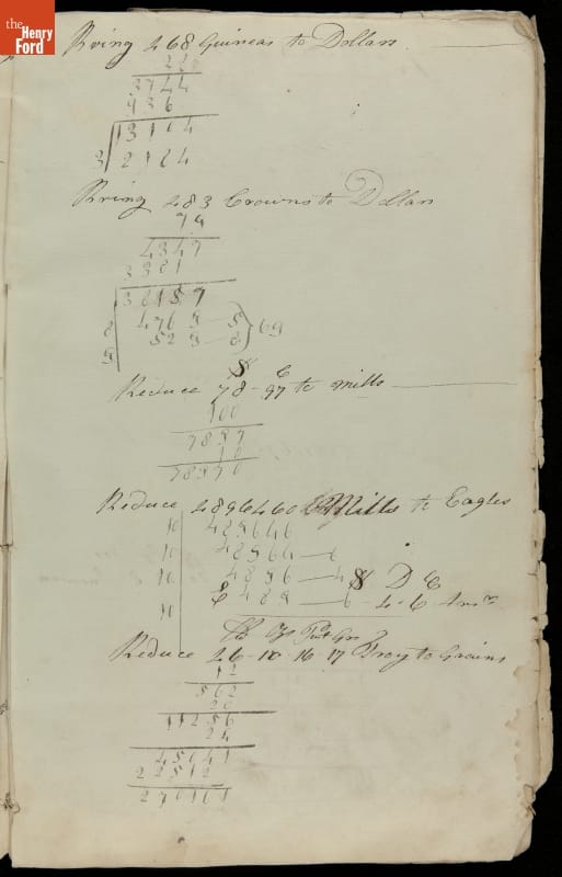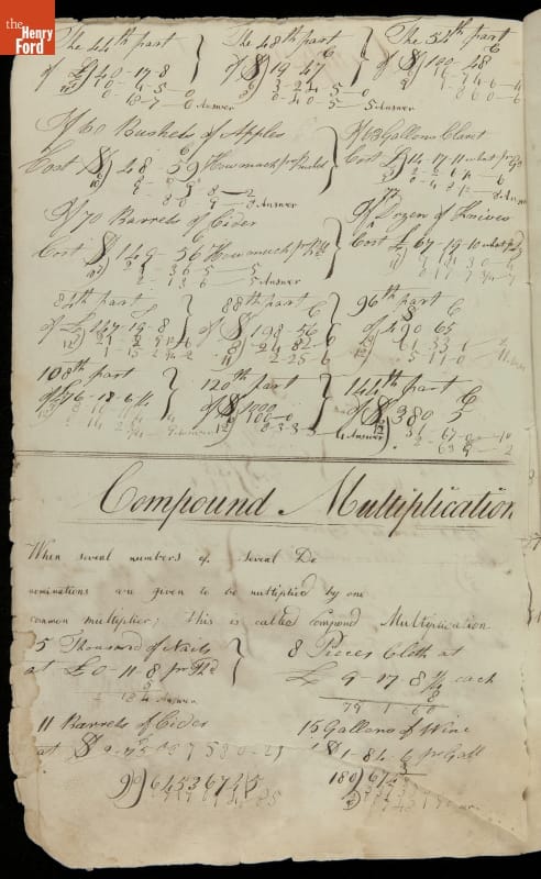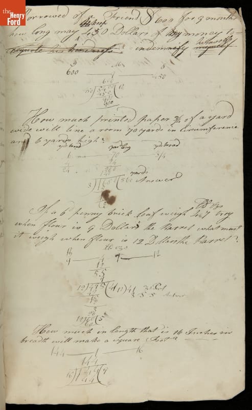 This copybook reveals arithmetic rules and examples and a student practicing numeration (place value), addition, subtraction, multiplication, division and conversions. The real-life problems reveal how Americans used math in their daily lives in 1800: measuring, buying and selling, making things, farming, eating and drinking, and more.