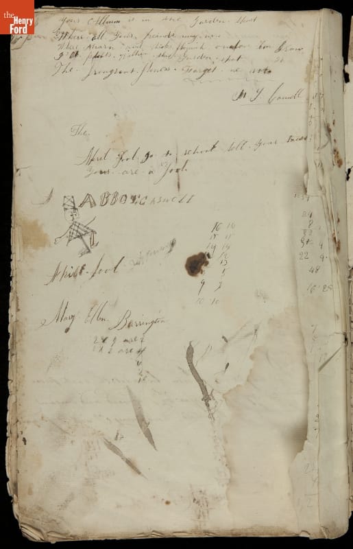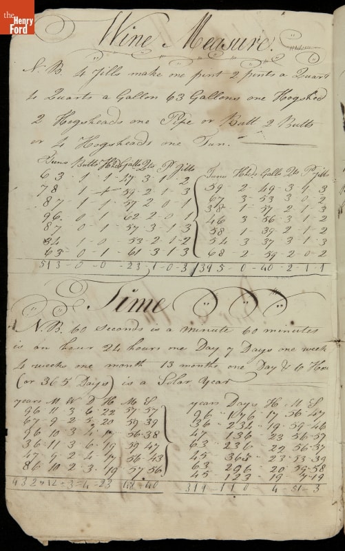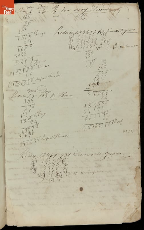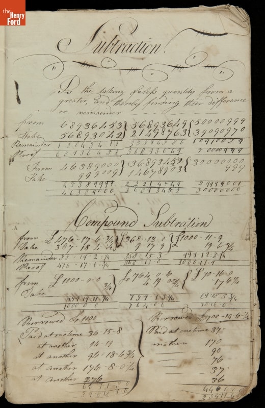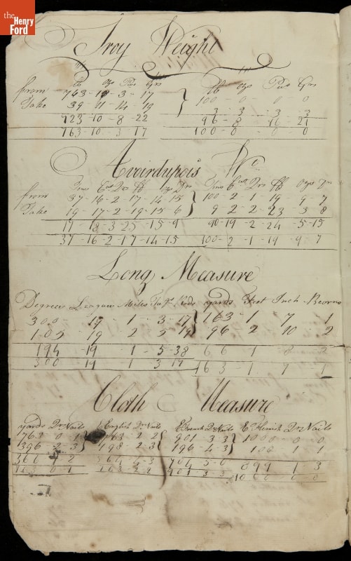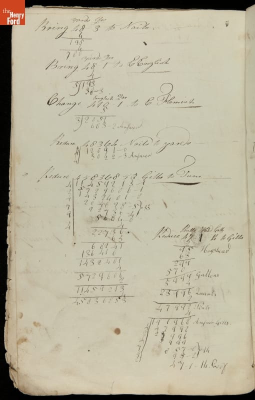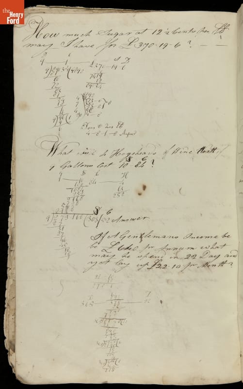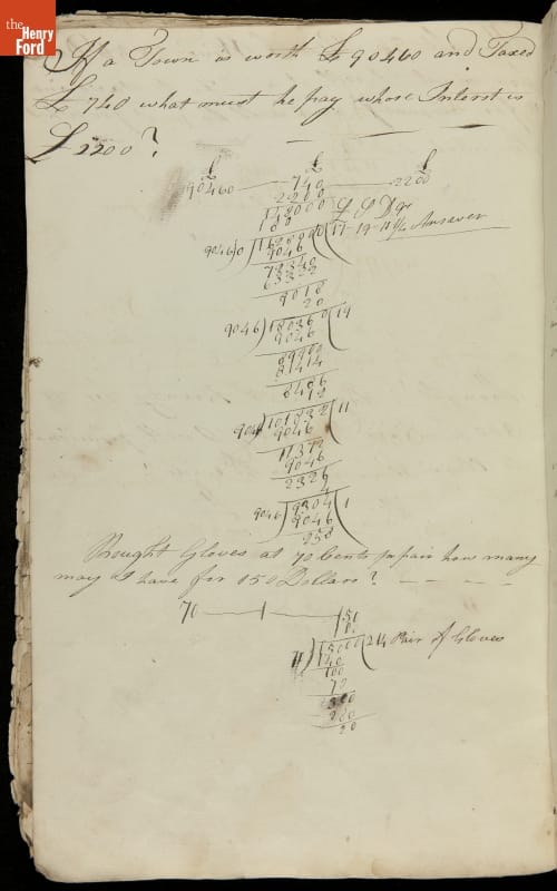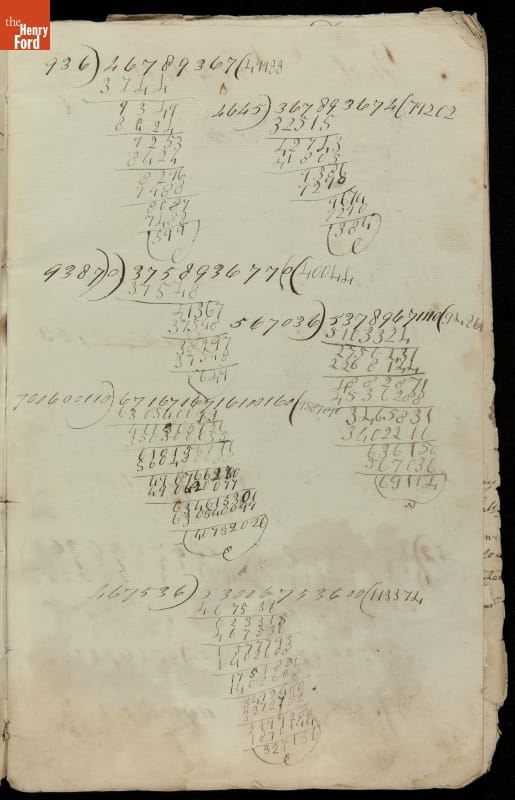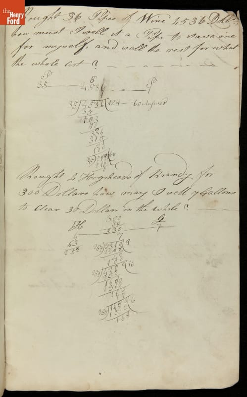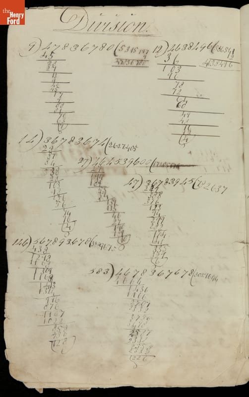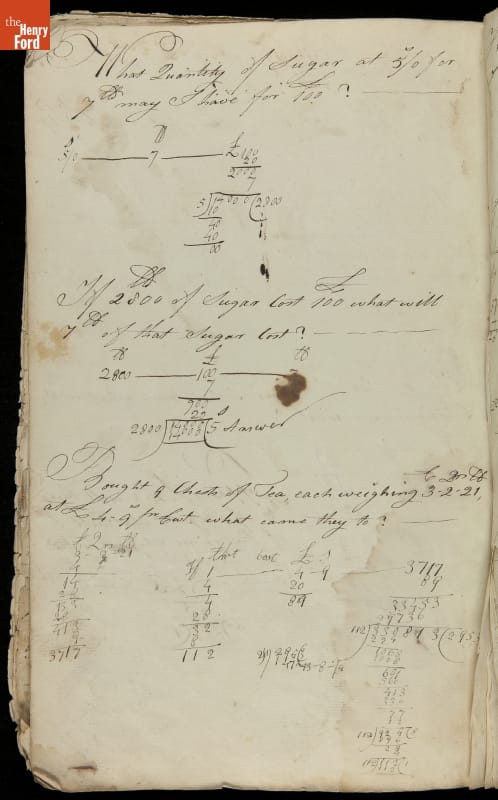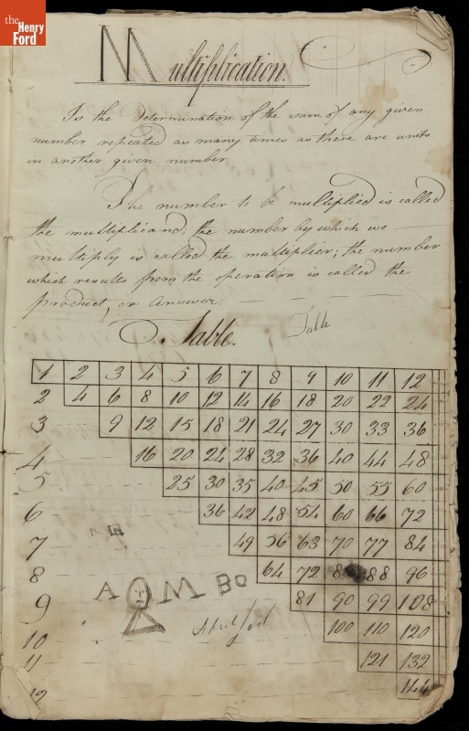 This copybook reveals arithmetic rules and examples and a student practicing numeration (place value), addition, subtraction, multiplication, division and conversions. The real-life problems reveal how Americans used math in their daily lives in 1800: measuring, buying and selling, making things, farming, eating and drinking, and more.