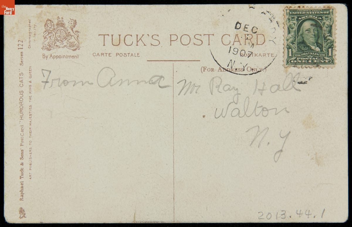 Depictions of cats and kittens often appeared in art and folk art in the United States. Inexpensive lithograph prints made in the mid-19th century helped to make this topic popular. Starting in the late 1890s picture postcards included these types of popular illustrations of cats. Sending colorful postcards through the U.S. mail continued to be widespread well into the 1910s.