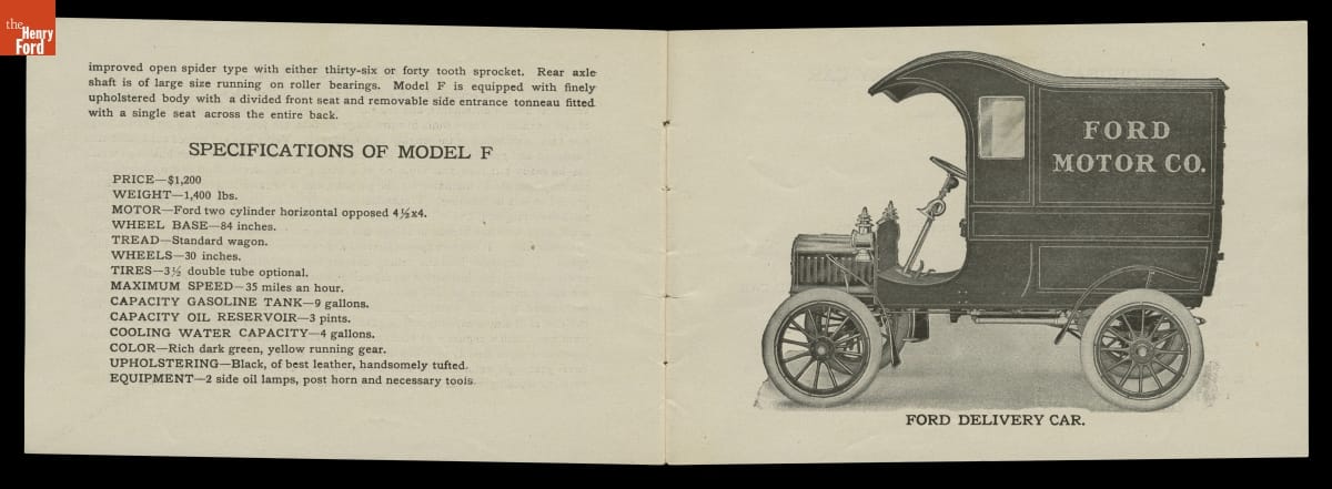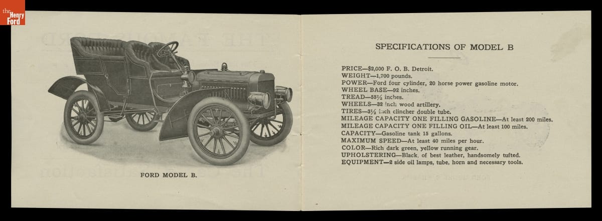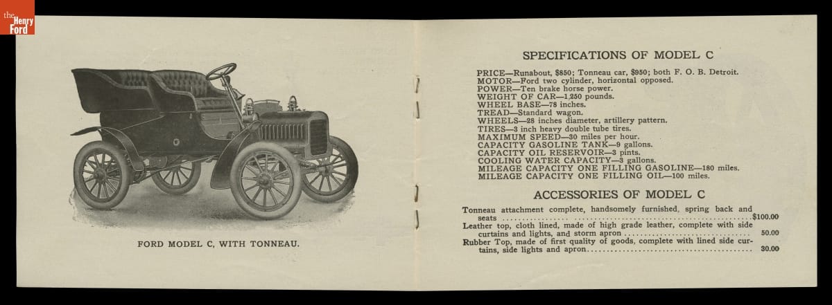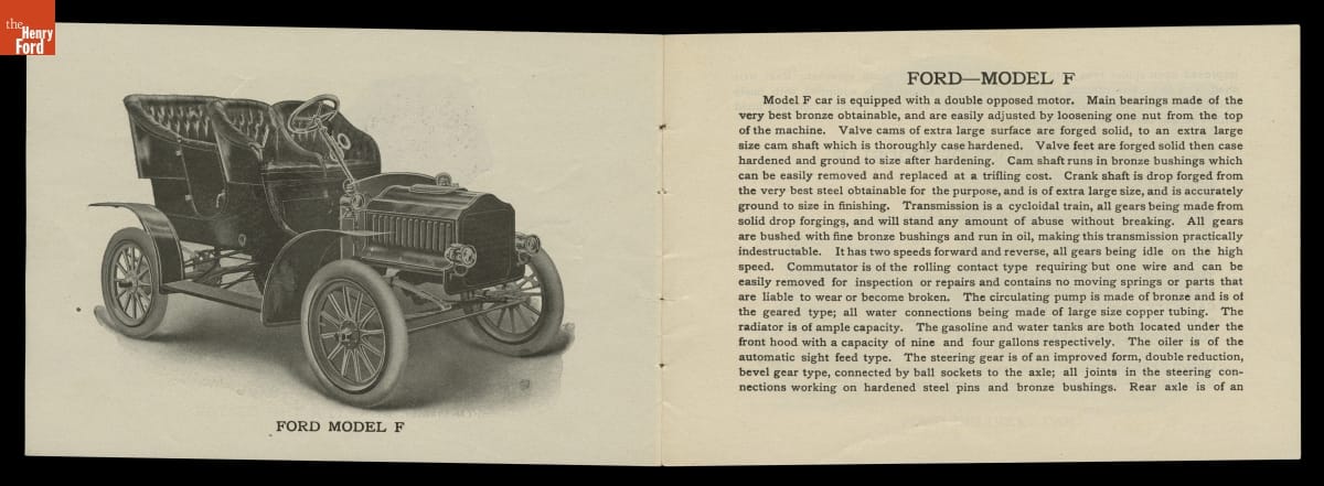 This 1905 Ford Motor Company sales brochure, like previous sales literature, continued to call Henry Ford's automobiles "The Car of Satisfaction." Ford set out to create a lightweight and inexpensive vehicle. Not satisfied with these early attempts, Ford continued to improve and innovate. In 1908, Ford created the vehicle he envisioned: the Model T.