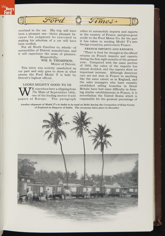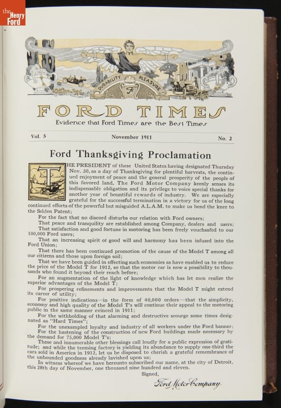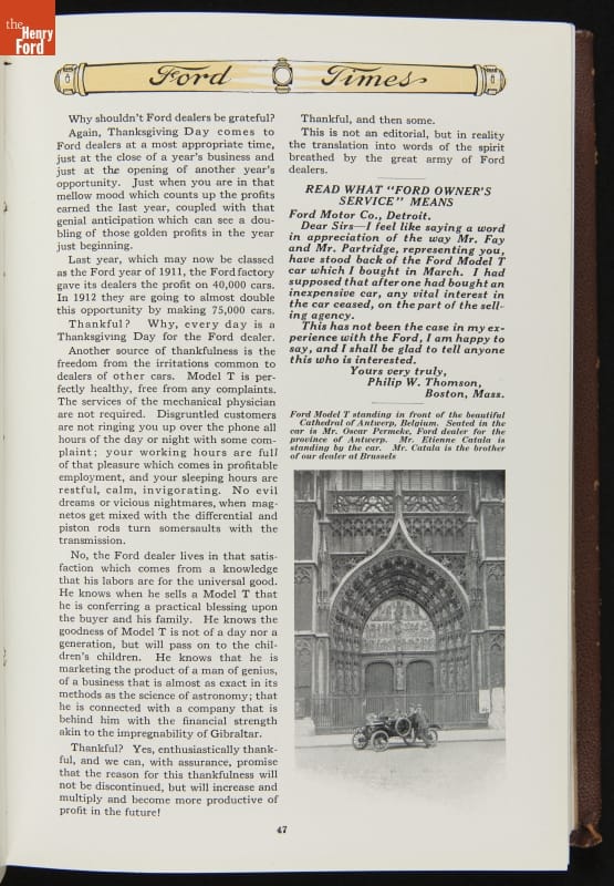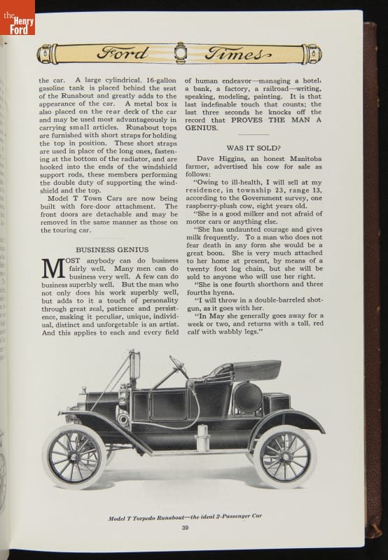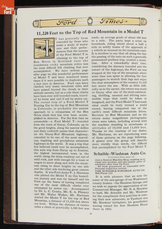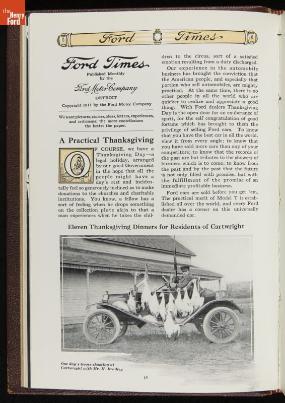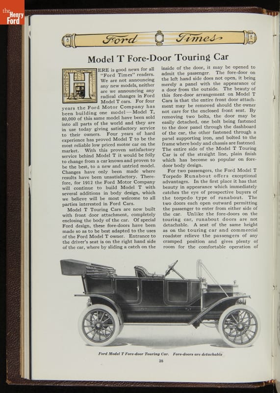 Ford Times was a widely distributed free publication created by the Ford Motor Company. Early issues targeted dealers. Later, editors expanded the magazine's content to cultivate loyalty among Ford owners and attract new customers. Travel articles, testimonials and mechanical advice appeared alongside sales content. Issues usually had colorful cover illustrations and numerous images of Ford automobiles and new Ford products.