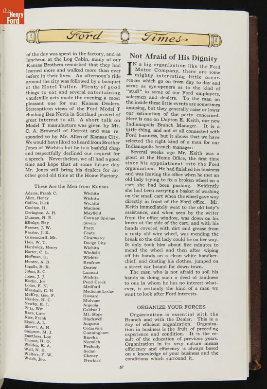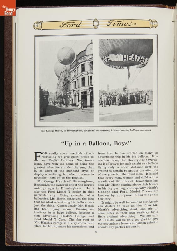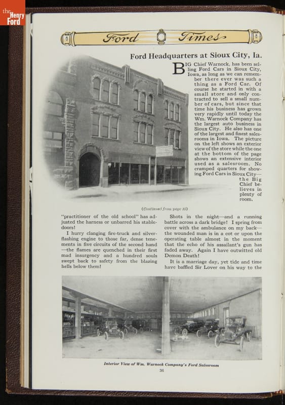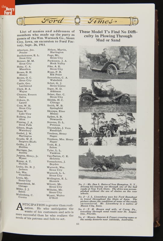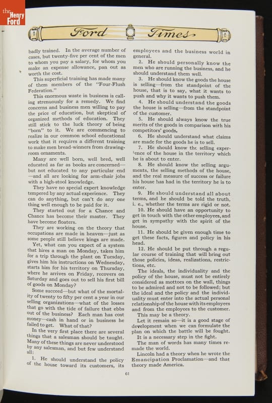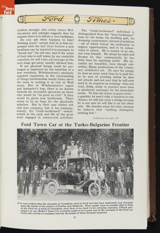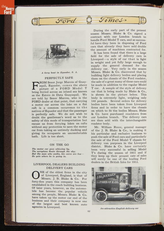 Ford Times was a widely distributed free publication created by the Ford Motor Company. Early issues targeted dealers. Later, editors expanded the magazine's content to cultivate loyalty among Ford owners and attract new customers. Travel articles, testimonials and mechanical advice appeared alongside sales content. Issues usually had colorful cover illustrations and numerous images of Ford automobiles and new Ford products.