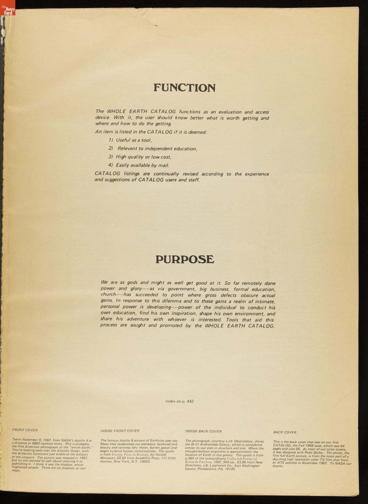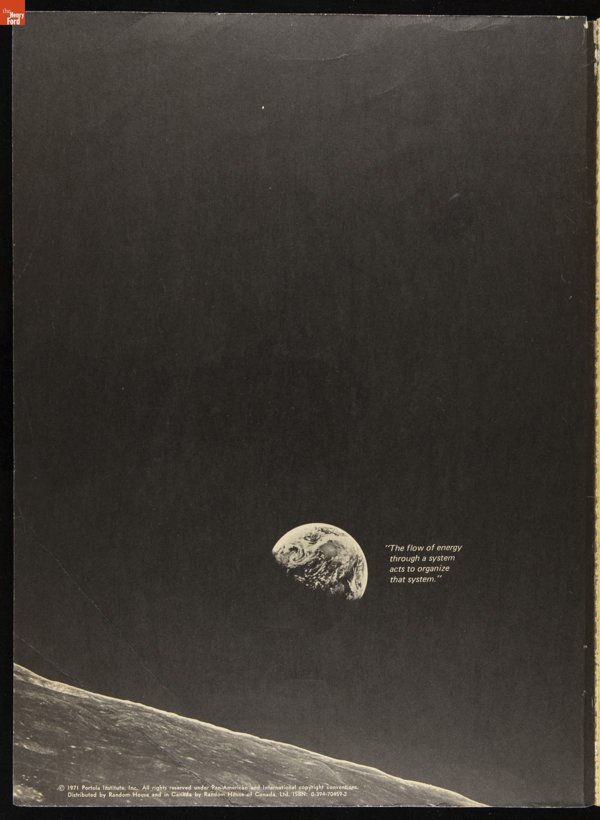 Biologist Steward Brand founded the Whole Earth Catalog in 1968, to share information about innovations in technology, design, and architecture. This "last" Whole Earth Catalog (1971) marked a philosophical shift from a counterculture approach toward shared responsibility to save the plant. It included images of Earth and space used in previous catalogs to help change people's perceptions of their responsibility for the globe.