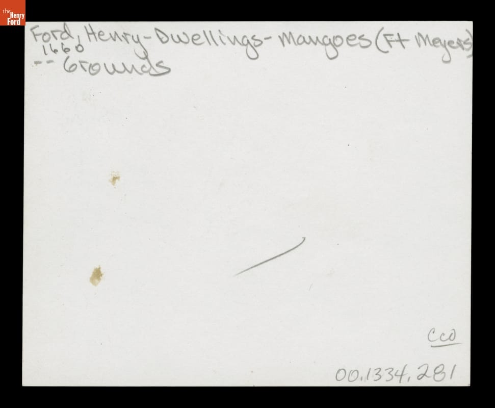 In 1916, Henry and Clara Ford purchased "The Mangoes." The Fort Myers, Florida, property adjoined the winter home of Thomas Edison -- Henry's friend and mentor. The Fords' estate featured a Craftsman bungalow and grounds lush with citrus trees and tropical plants. This image shows the variety of plant life found at the Fords' winter retreat.
