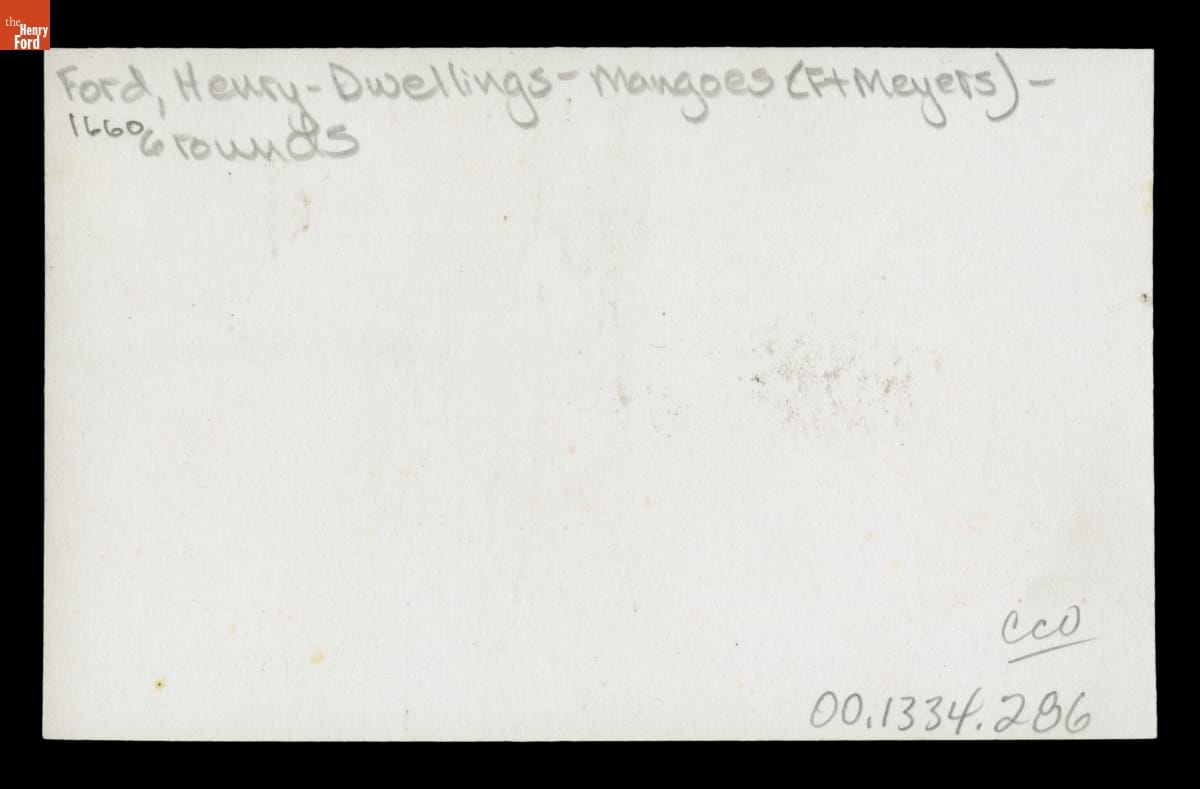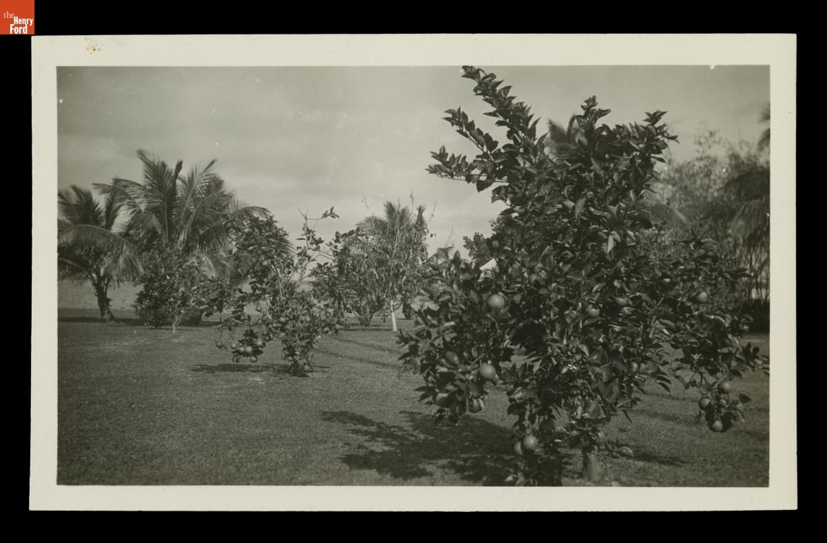 In 1916, Henry and Clara Ford purchased "The Mangoes." The Fort Myers, Florida, property adjoined the winter home of Thomas Edison -- Henry's friend and mentor. The Fords' estate featured a Craftsman bungalow and grounds lush with citrus trees and tropical plants. This image shows the variety of plant life found at the Fords' winter retreat.