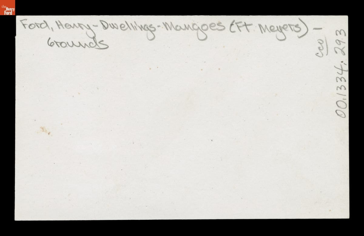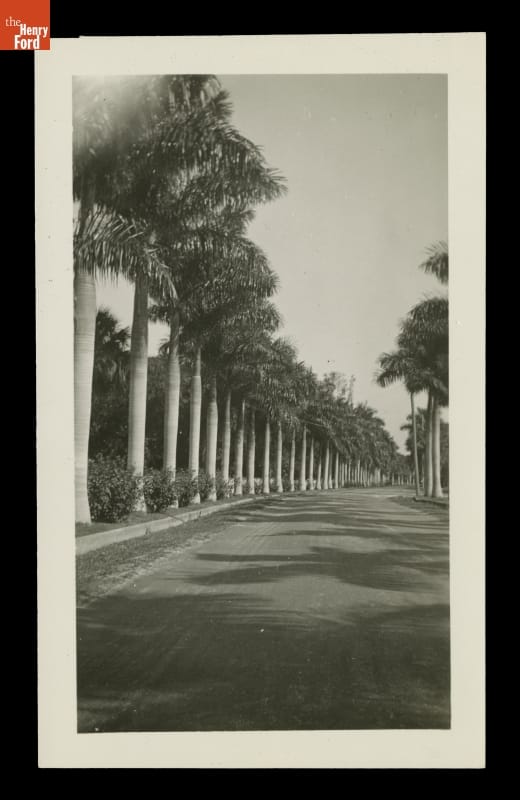In 1916, Henry and Clara Ford purchased "The Mangoes." The Fort Myers, Florida, property adjoined the winter home of Thomas Edison -- Henry's friend and mentor. The Fords' estate featured a Craftsman bungalow and grounds lush with citrus trees and tropical plants. This image shows one of the streets near their residence lined with stately royal palms.