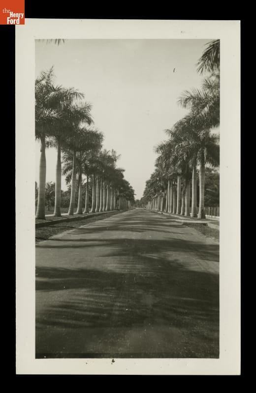 In 1916, Henry and Clara Ford purchased "The Mangoes." The Fort Myers, Florida, property adjoined the winter home of Thomas Edison -- Henry's friend and mentor. The Fords' estate featured a Craftsman bungalow and grounds lush with citrus trees and tropical plants. This image shows one of the streets near their residence lined with stately royal palms.