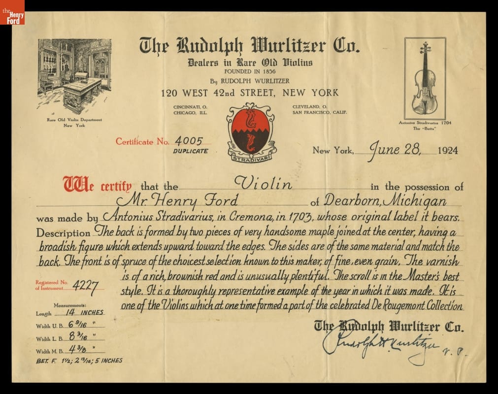 An amateur fiddler, Henry Ford had a special passion for the violin. This wealthy industrialist could choose from among the finest. In the 1920s, Ford purchased several classical violins through the Wurlitzer Company's violin department. In this album are the certificates of authenticity provided by the company, identifying each violin's maker, describing its construction, and listing previous owners, if known.