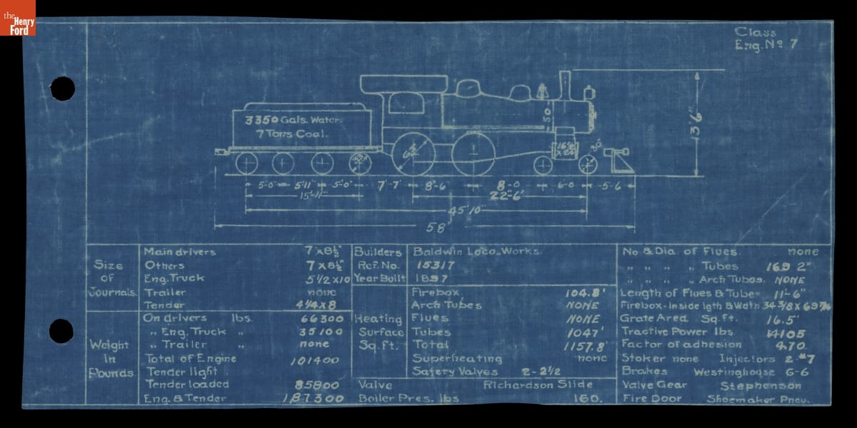 Blueprint Drawing of the 1897 Baldwin Steam Locomotive, "Engine No. 7," circa 1921