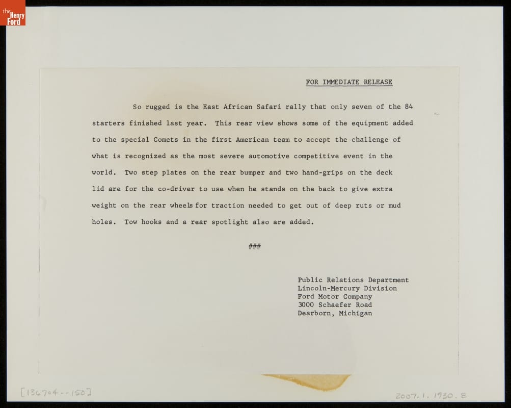 The East African Safari Rally tested a car's and driver's endurance. During the 1960s, the rally's course covered thousands of miles passing through Kenya, Tanganyika (Tanzania) and Uganda. Drivers could expect punishing road conditions. Mud or dust was commonplace. And dodging wild animals could be expected. In 1964, the first American teams entered the grueling competition driving Mercury Comet Calientes.