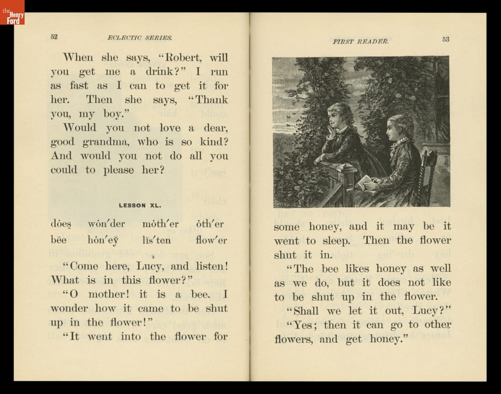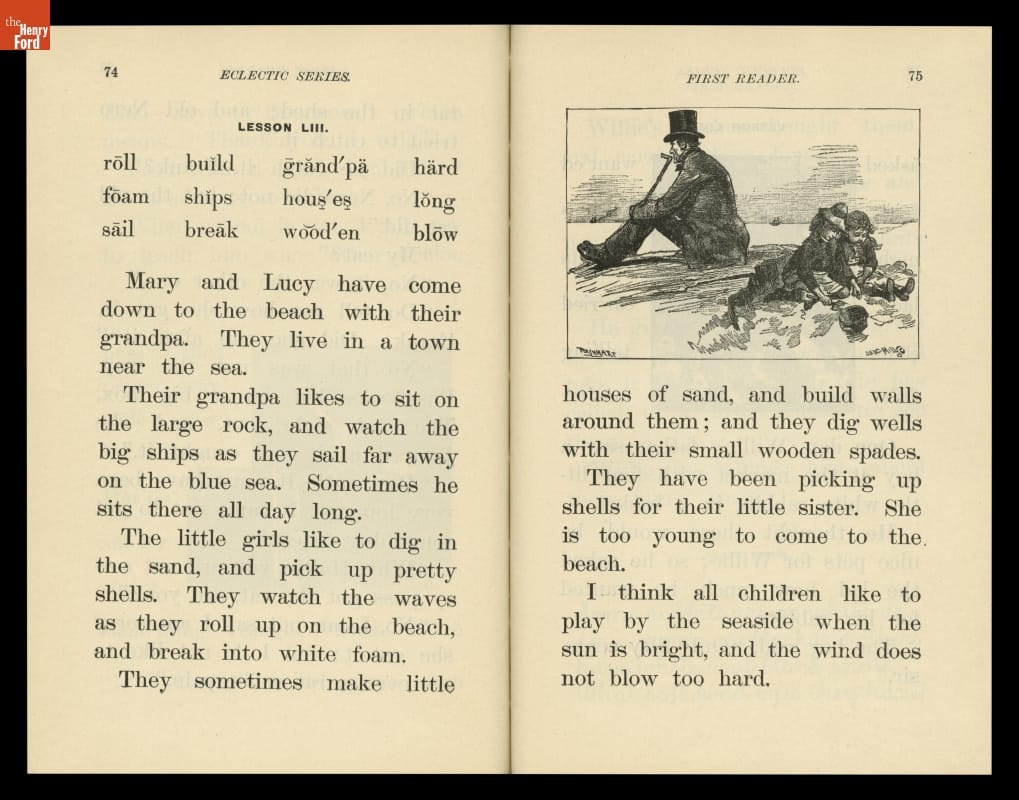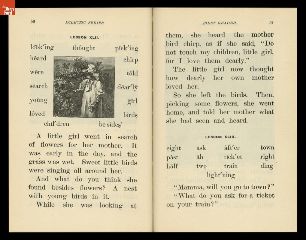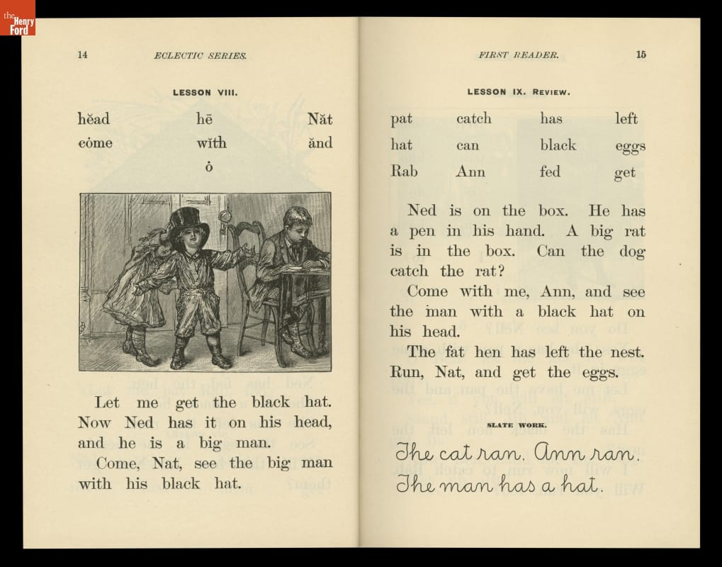 The McGuffey Readers textbook series was used in American schools during the nineteenth and early twentieth centuries. The Readers emphasized the fundamental skills of reading and writing but included stories on a wide range of subjects from many sources (hence, "eclectic"). The books were also intended to develop proper character in children, and had a religious overtone.