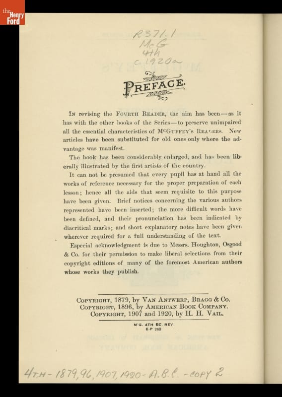 Written by William Holmes McGuffey. Revised edition copyright 1879 by Henry Hobart Vail. Published 1920 by American Book Company, New York, New York.