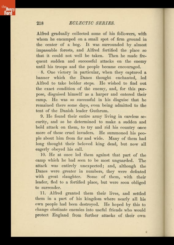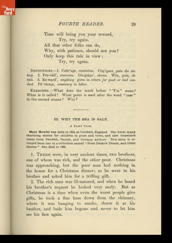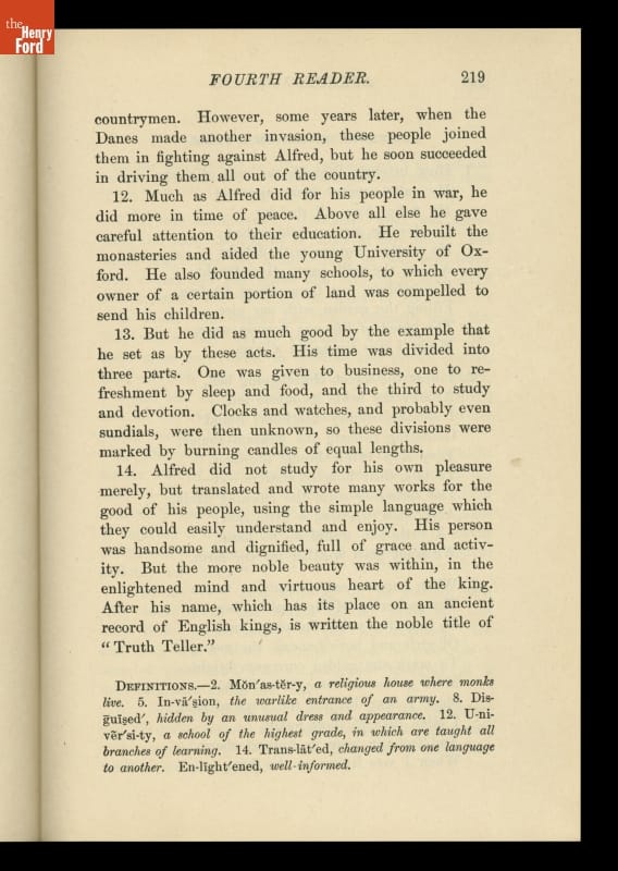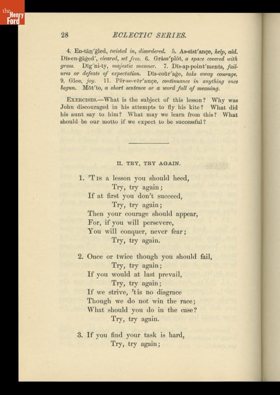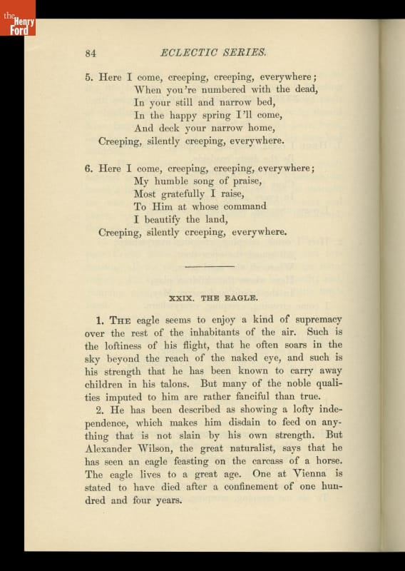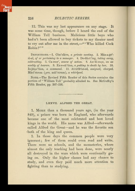 The McGuffey Readers textbook series was used in American schools during the nineteenth and early twentieth centuries. The Readers emphasized the fundamental skills of reading and writing but included stories on a wide range of subjects from many sources (hence, "eclectic"). The books were also intended to develop proper character in children, and had a religious overtone.
