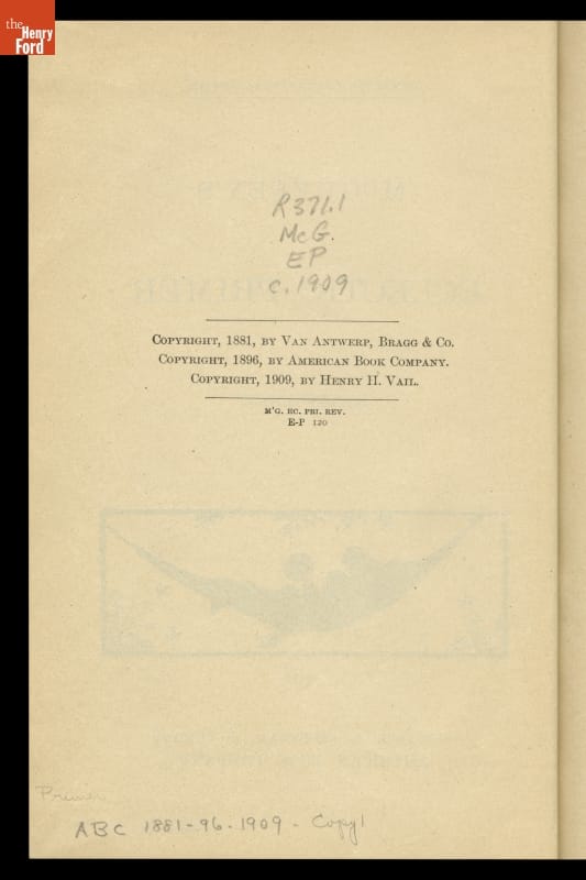 Written by William Holmes McGuffey. Revised edition copyright 1881 by Henry Hobart Vail. Published 1909 by American Book Company, New York, New York.
