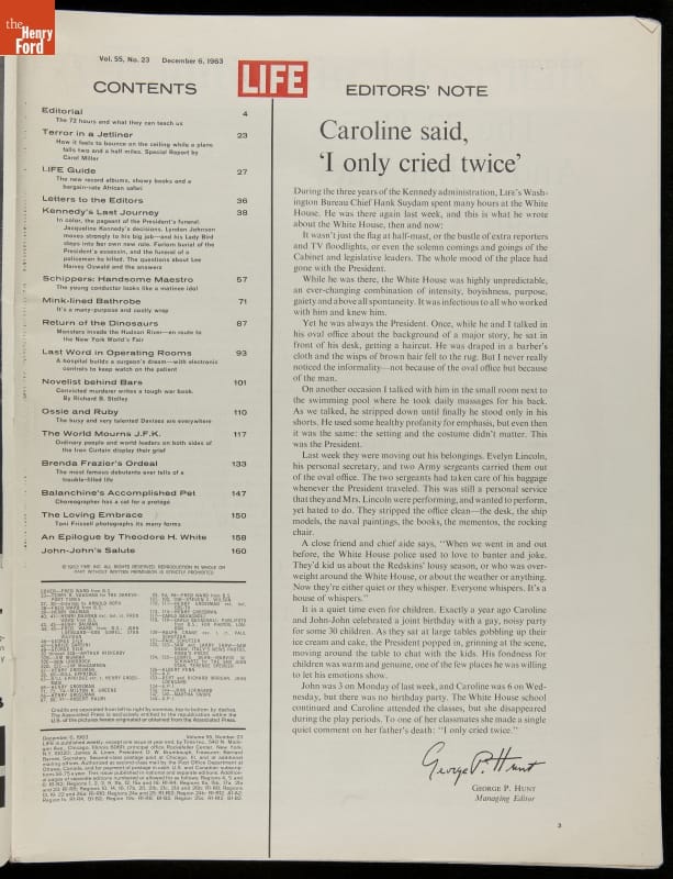 Life magazine was one of the popular documenters of American life at the time of John F. Kennedy's presidency. Photographs of the young President with his glamorous wife Jacqueline and their two attractive children captivated the country. After President Kennedy's assassination, Life magazine used a poignant moment during the funeral to help its readers mourn with the President's family.