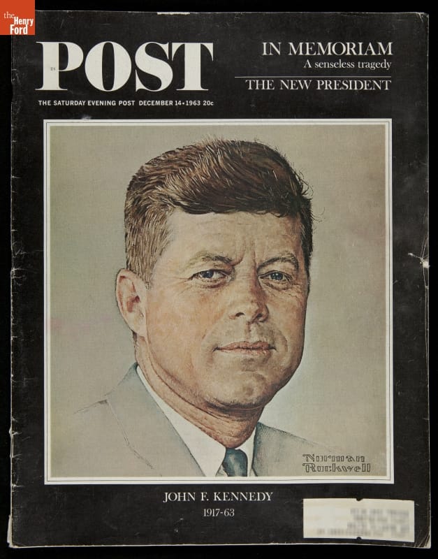 Stunned and disillusioned Americans eagerly embraced commemorative books and magazines following the tragic death of President Kennedy on November 22, 1963. The cover of this 84-page commemorative issue of Saturday Evening Post features Norman Rockwell's portrait of John F. Kennedy.