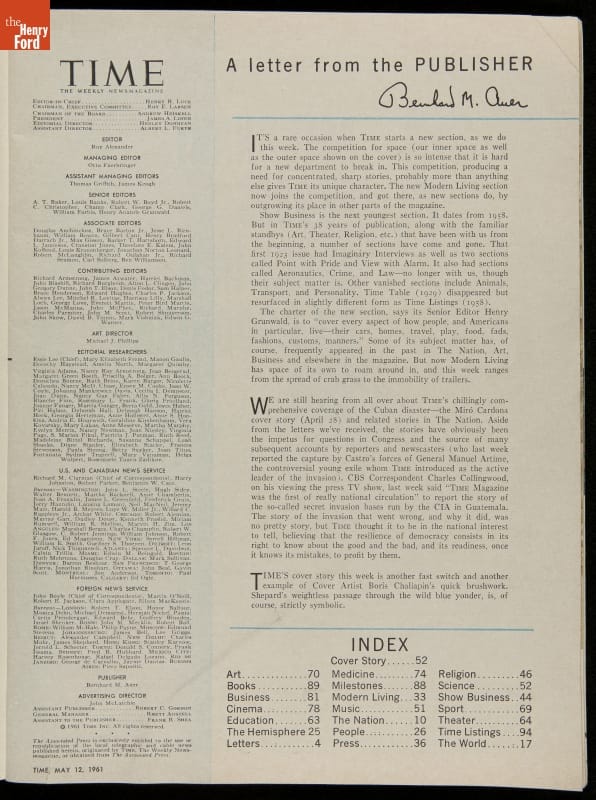 President John F. Kennedy's vision to explore the "new frontier" of space was an overt Cold War strategy against the Soviet Union which launched the first man in space April 12, 1961. This cover story featured the first U.S astronaut in space, Alan Shepard. His Freedom 7 capsule reached 116.5 miles above the earth before splashing down on May 5, 1961.