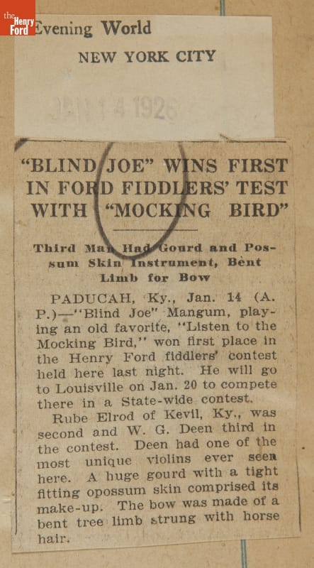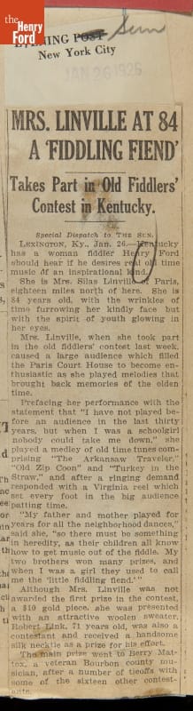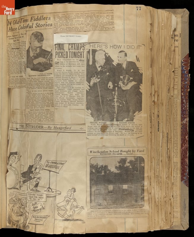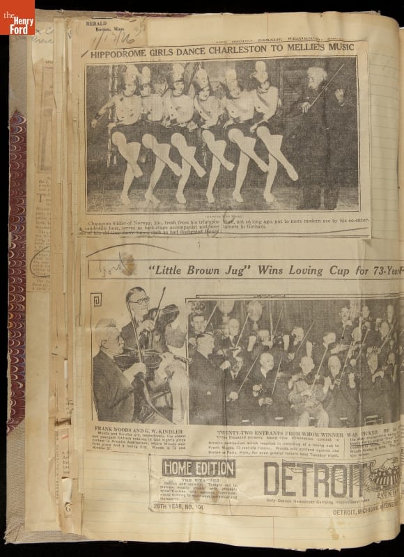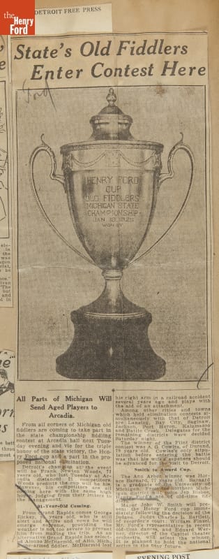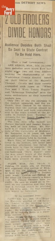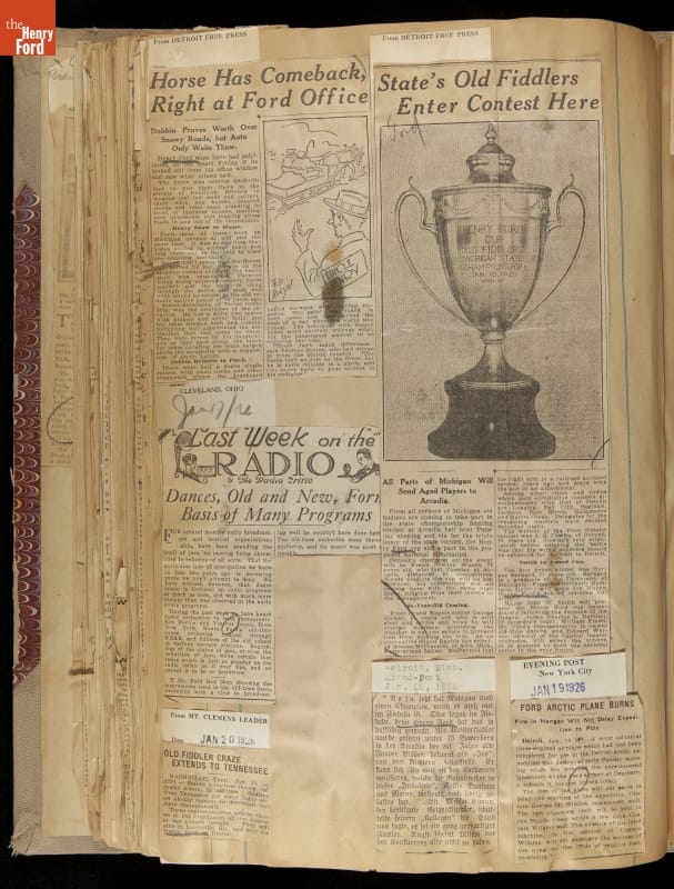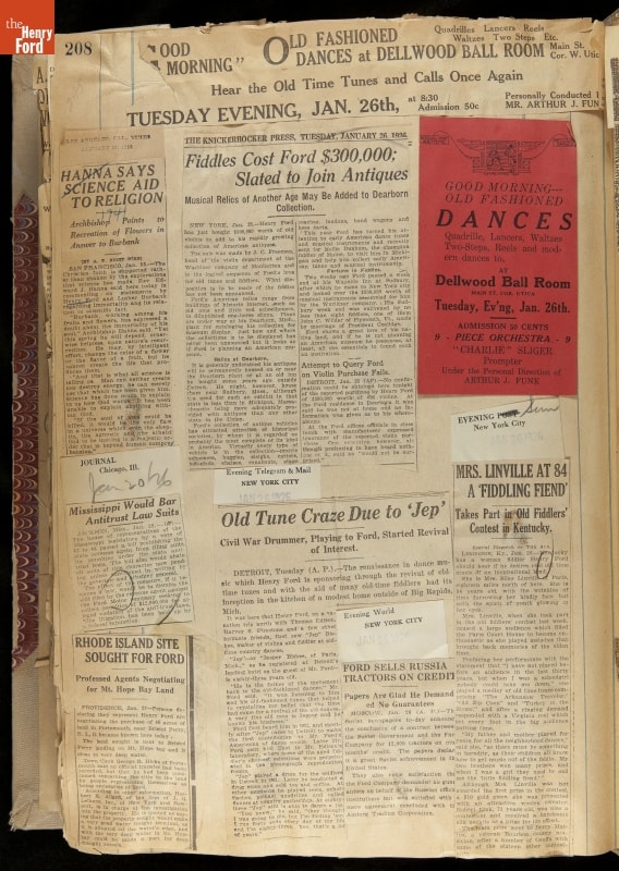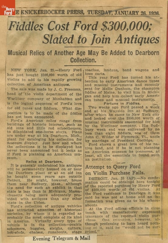 The press took note of Henry Ford's classical violin acquisitions during the mid-1920s. This Albany, New York, newspaper article, published in January 1926, exaggerated the price Ford paid for his centuries-old violins made by Italian masters like Antonio Stradivari. (The figure was probably closer to $100,000.) But the article clearly linked Ford's violin purchases to his interest in "old tunes and fiddlers."