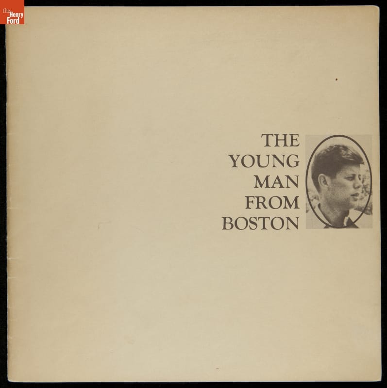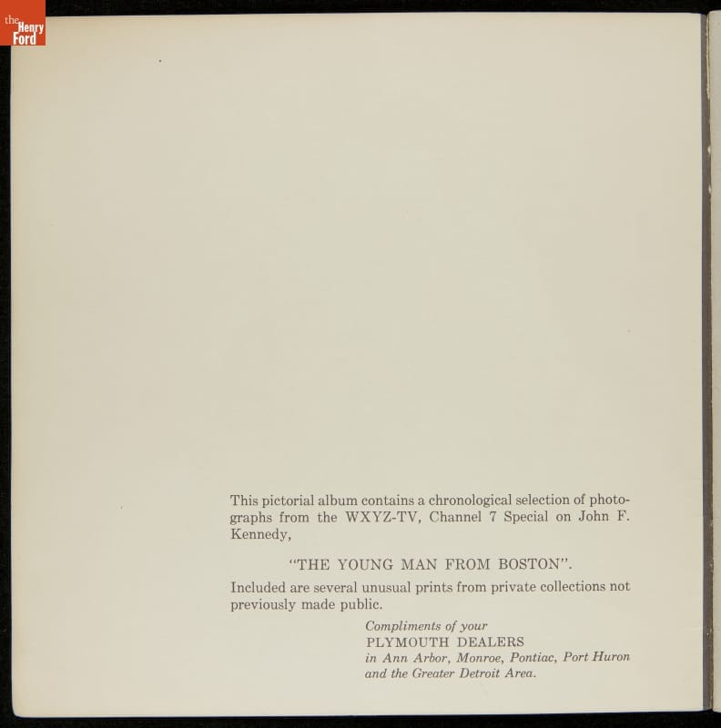 Stunned and disillusioned Americans eagerly embraced commemorative books following the tragic death of President John F. Kennedy on November 22, 1963. This booklet included a selection of photographs from the WXYZ-TV Channel 7 special, "The Young Man from Boston." A record album of this special was also released that included songs by the Kingston Trio and the Mormon Tabernacle Choir.