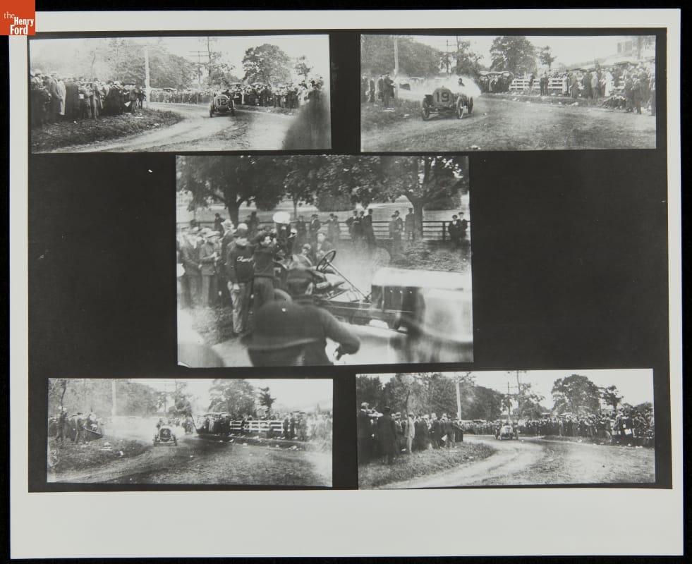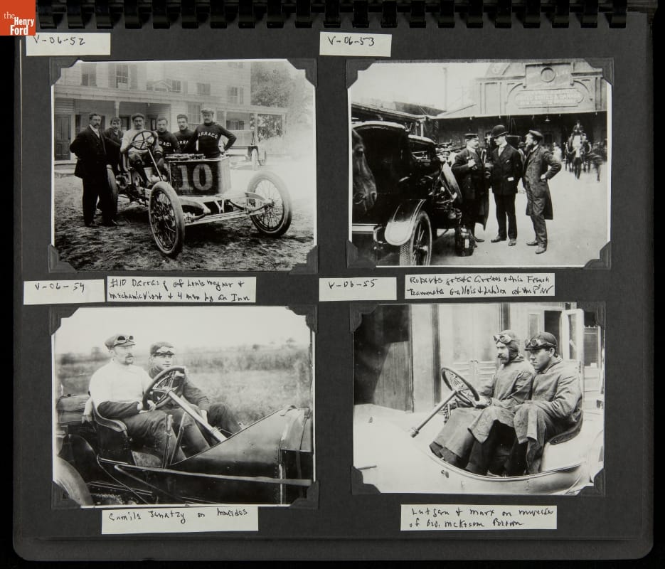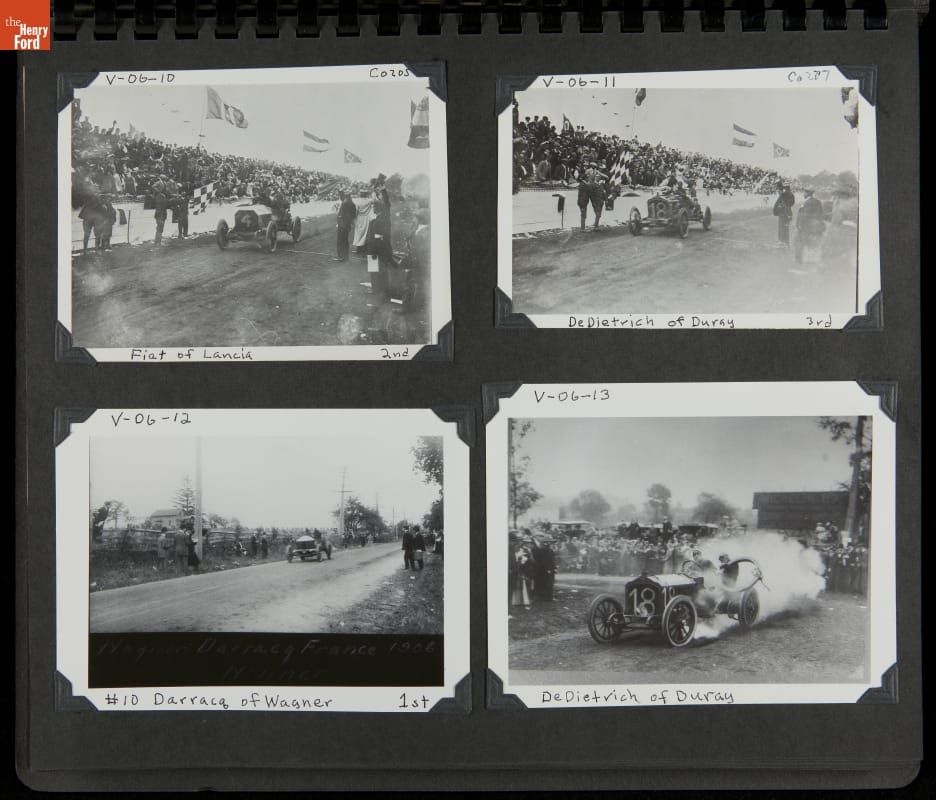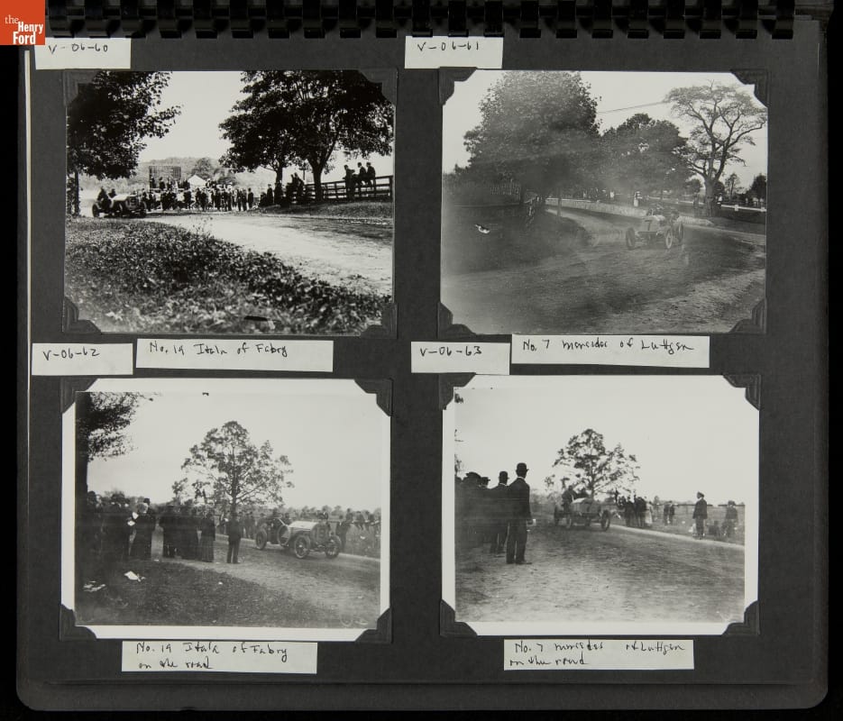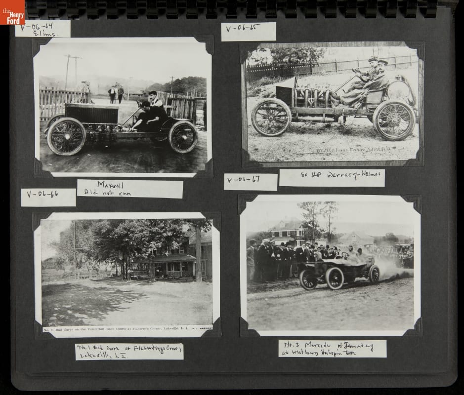 The Vanderbilt Cup, held on New York's Long Island from 1904 to 1910, was America's first internationally prominent automobile race. William K. Vanderbilt, Jr., a wealthy railroad heir, organized the competition over public roads. European cars dominated the event's first years. This photo album documents the 1906 race, won by French driver Louis Wagner in a French-built Darracq.