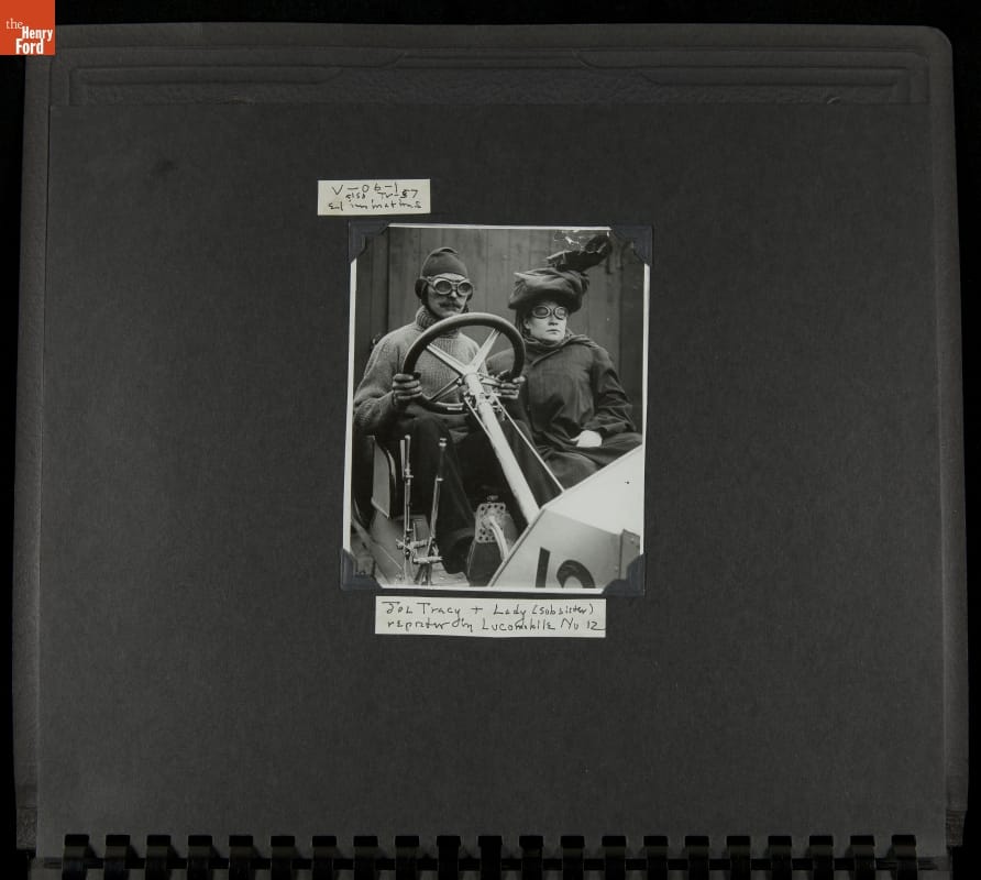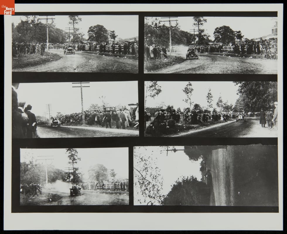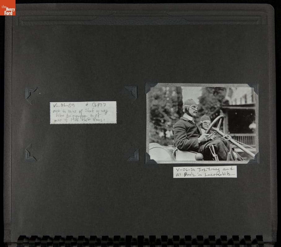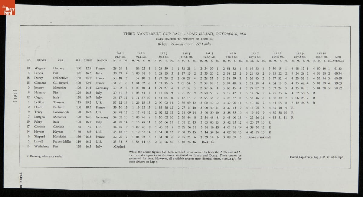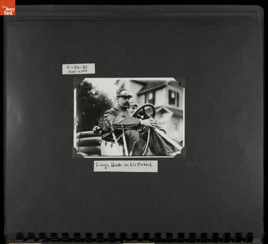 The Vanderbilt Cup, held on New York's Long Island from 1904 to 1910, was America's first internationally prominent automobile race. William K. Vanderbilt, Jr., a wealthy railroad heir, organized the competition over public roads. European cars dominated the event's first years. This photo album documents the 1906 race, won by French driver Louis Wagner in a French-built Darracq.